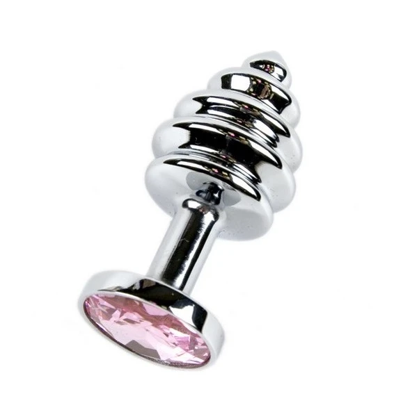 Ребристая анальная втулка серебристого цвета с розовым кристаллом. Размер: длина 7,5 см, диаметр 3 см.