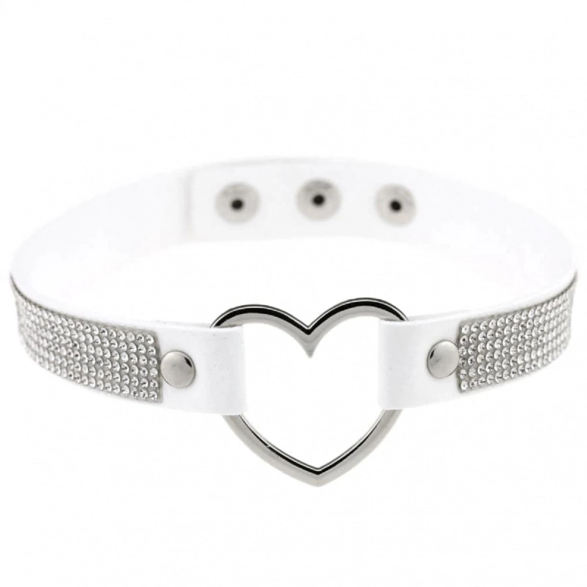 Стильный чокер из белой экокожи с металлическим сердцем и стразами. Размер: длина чокера 39 см, ширина - 1,8 см. Регулируется при помощи кнопок застежек.
