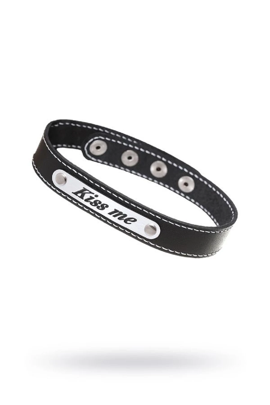 Такой чокер привлечет внимание не только любителей БДСМ ролевых игр, но и тех, кто хочет добавить в свой повседневный образ немнго дерзости. Натуральная кожа, изысканная скромность, удобство фиксации при помощи кнопок – у него есть все, чтобы стать одним из самых любимых акссесуаров в вашей спальне. Чокер изготовлен из натуральной кожи и дополнен вставкой под металл с надписью Kiss me. Регулируется при помощи кнопок.Размер: длина 41 см, ширина ремешка 2 см. Цвет черный.