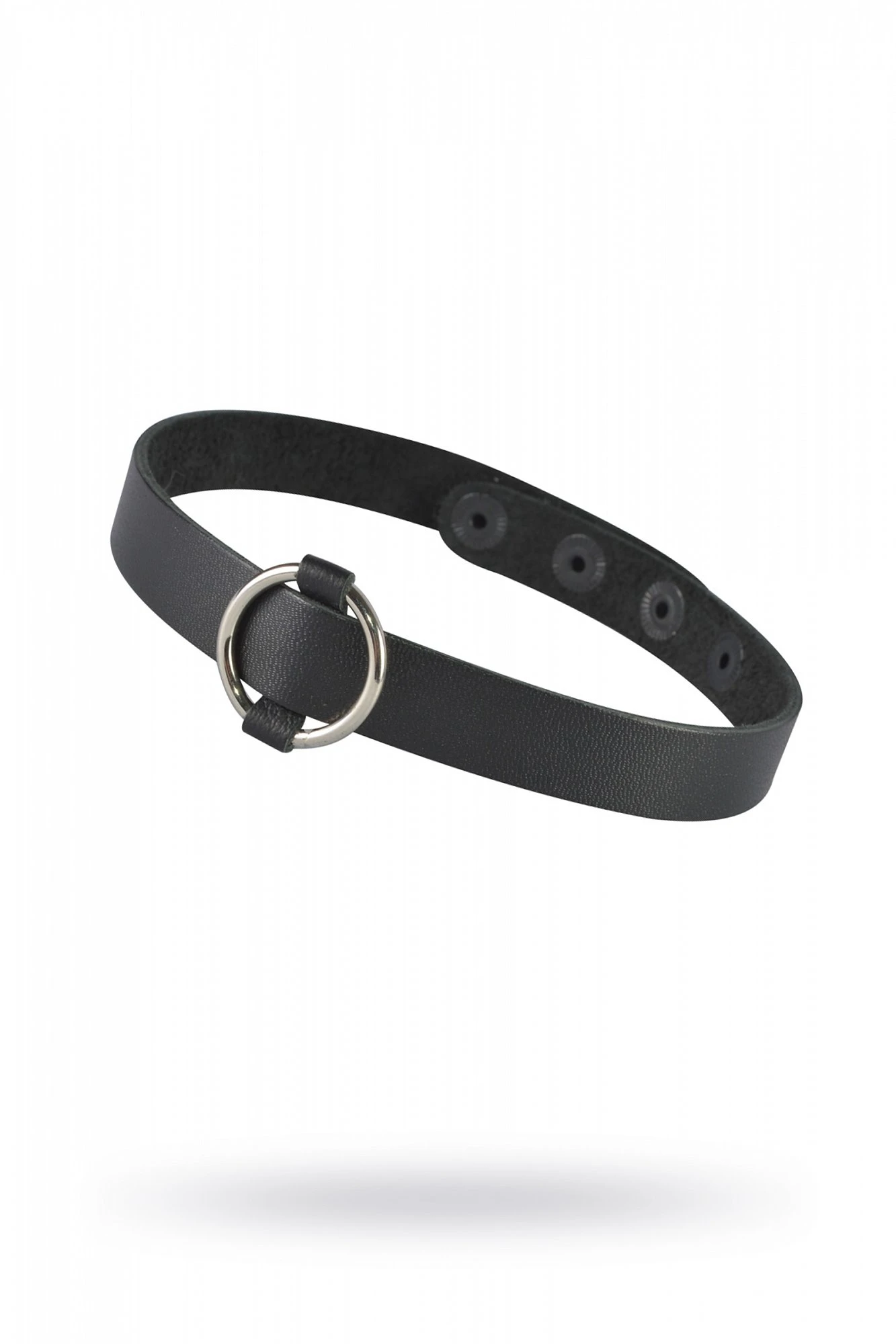 Чокер из натуральной кожи черного цвета, декорирован металлическим кольцом. Регулируется при помощи кнопок. Длина 40 см, ширина 1,5 см. Металлическое кольцо имеет никелевое покрытие.
