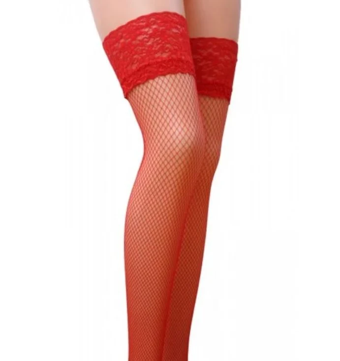 Изумительные чулочки из мелкой сеточки с кружевной резинкой. Идеально садятся на ножки, подчеркивая их стройность. Будут отличным дополнением к сексуальному белью. Благодаря силиконовым полоскам на резинке чулки отлично держатся на ноге. Размер: S/M. Цвет: красный.