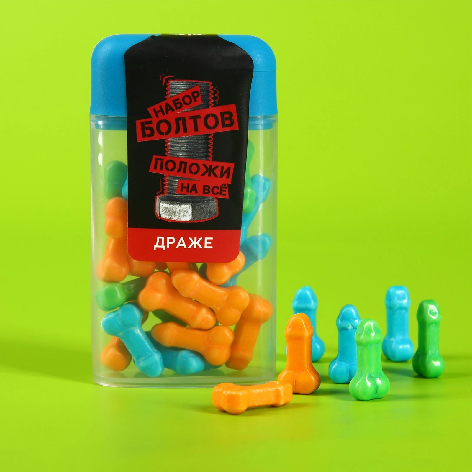Драже в пластиковой баночке Набор болтов, положи на все 18+. Состав: глюкоза 76,21 %, сахар 15 %, сироп глюкозы 5 %, мальтодекстрин 3 %, лимонная кислота 0,5 %, стеарат магния 0,25 %, искусственный ароматизатор 0,02 %, искусственный краситель 0,01 %, Е129, Е102, Е133, Е171.