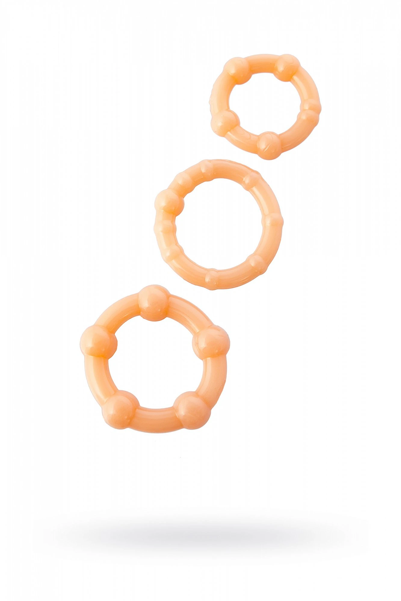 Набор из трех эрекционных колец. Кольца надеваются на основание полового члена для поддержания его в состоянии эрекции длительное время. Для более комфортного использования рекомендуем приобрести смазку на водной основе и очищающий спрей Clear Toy 100 мл для обработки изделия. Диаметр 3,5 см (растягиваются). Цвет: телесный.