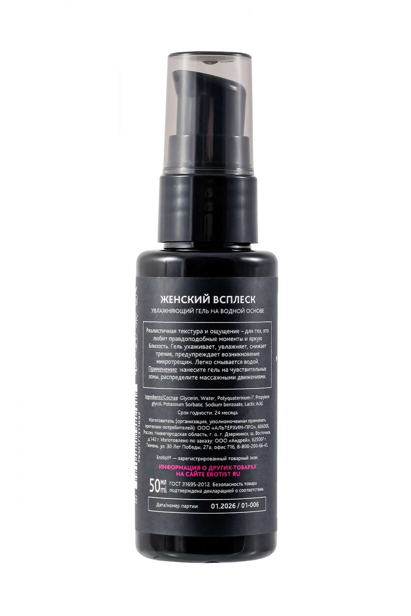 Erotist Woman Splash - средство для естественного комфорта во время полового акта, созданное с акцентом на женскую физиологию, нежность ощущений и заботу о микрофлоре. Его формула дарит мягкое, естественное скольжение и ощущение увлажненности без липкости и утяжеления. Один из компонентов состава обволакивает кожу тонким защитным слоем, делая её более гладкой и чувствительной, снимая ощущение сухости и предотвращая раздражение. Текстура лубриканта бархатистая, легкая, максимально приближенная к естественной женской смазке, что делает контакт более естественным. Молочная кислота в составе играет ключевую роль в поддержании интимного здоровья: она помогает сохранять оптимальный уровень pH 4.5, поддерживает баланс микрофлоры и создает благоприятную среду для полезных лактобактерий, что особенно важно для ежедневного комфорта и профилактики дискомфортных ощущений любой женщины. Водная основа. Срок годности: 24 месяца.