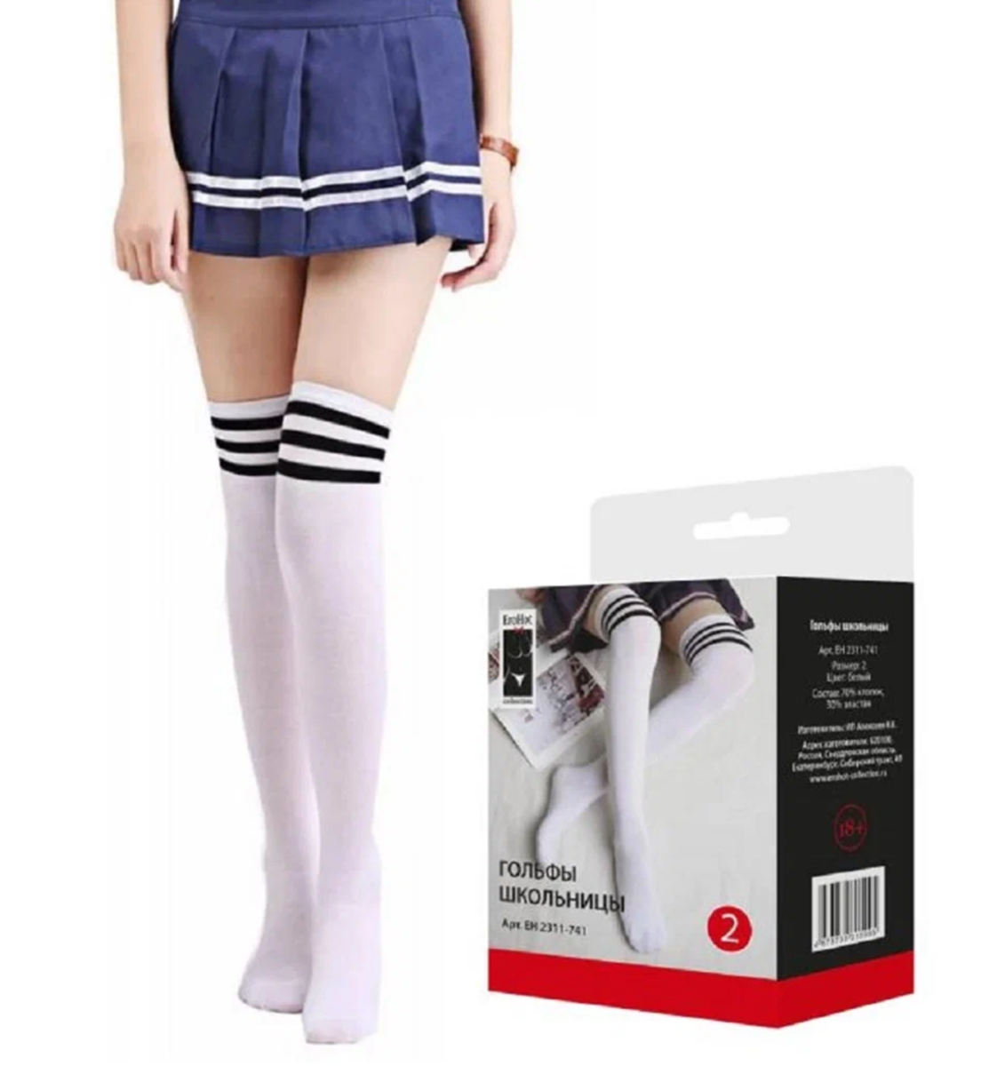 Белые гольфы с чёрными полосками помогут создать невинный образ и станут завершающим штрихом в образе школьницы или озорной студентки. Длина 45 см. Состав: 70% хлопок, 30% эластан. Цвет: белый. Размер: 2(S).