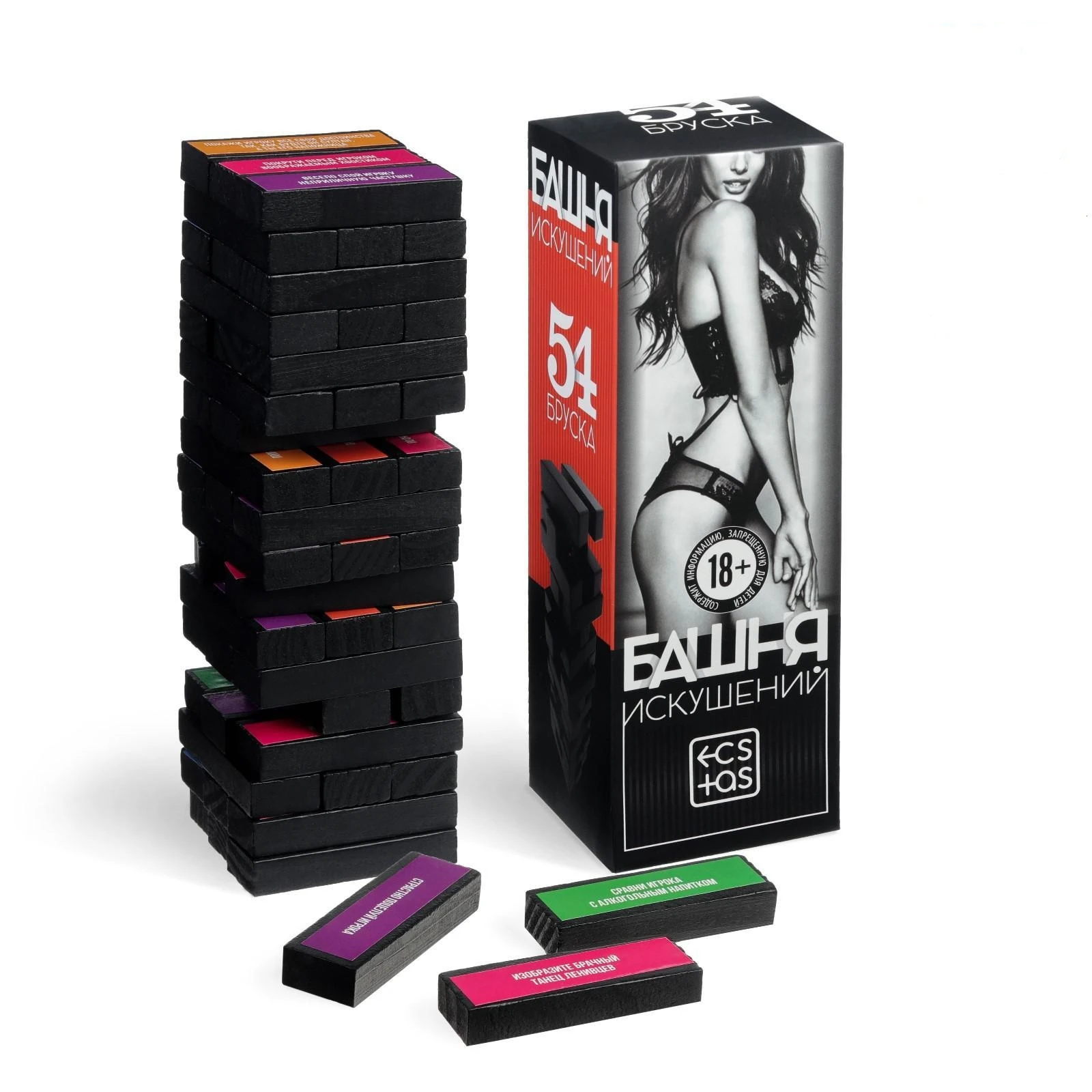 Устройте вечеринку, будоражащую ваше воображение! Постройте падающую башню, позовите друзей и выполняйте пикантные задания! В наборе вы найдёте 54 деревянных бруска с фантами, способными поднять настроение каждому! «Дженга» — залог общения и раскрепощения! Неожиданные задания разнообразят любой праздник! Каждое написано на фоне определённого цвета (всего их шесть). Перед началом игры распределите цвета между игроками. Постройте башню и вытягивайте бруски так, чтобы она не упала. Тот, кто вытянул деталь, зачитывает задание и выполняет его с тем игроком, чей цвет указан на бруске. Вас ждут веселье, много смеха и пикантных подробностей — устоять просто невозможно! Победит тот, кто вытягивал последним до того, как «постройка» развалится! В набор входят 54 деревянных бруска с фантами (7 х 1,8 х 2,2 см).