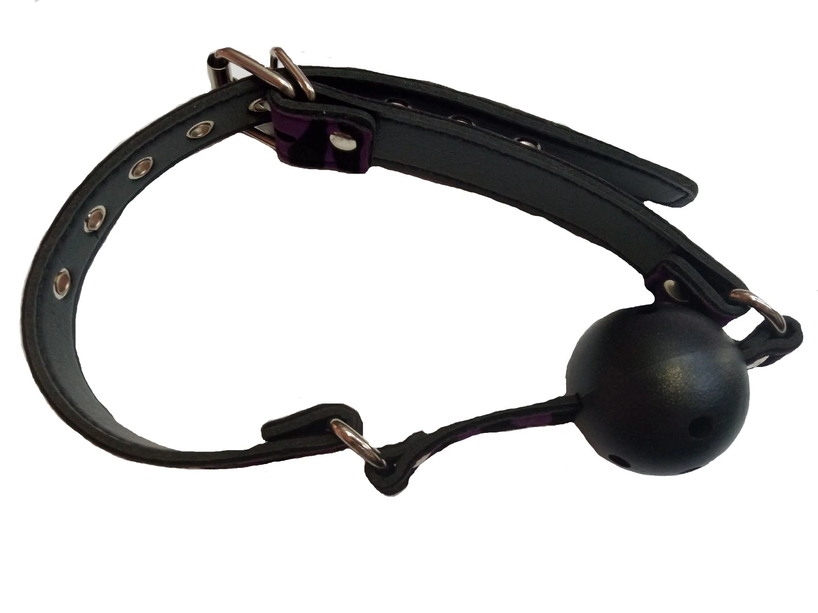Кляп черного цвета из ABS пластика с дыхательными отверстиями, черный ремешок из искусственной кожи с фиолетовыми полосками. Размер: длина 60 см, диаметр шара 4,5 см.