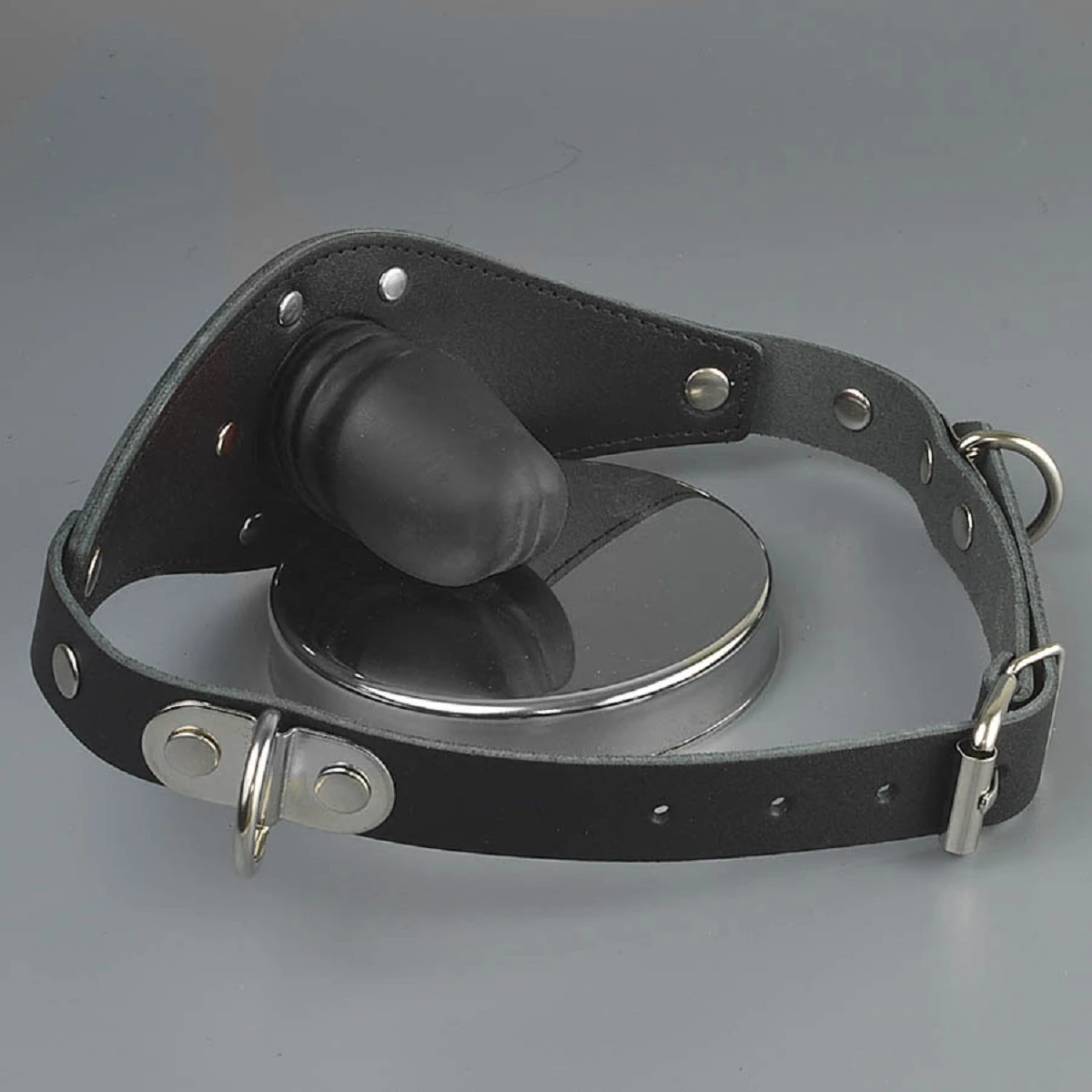 Кожаный кляп – это один из символов покорности, так как он лишает подчиняющегося, возможности говорить и создаёт ощущение полной беспомощности. Кляп представляет собой упругий фаллос, из натурального латекса, который размещён на кожаном щите с регулирующимися ремешками. Полукольца, находящиеся по бокам, предназначены для крепления к ним повода или бандажа. Фурнитура, используемая в изготовлении кляпа, никелирована. Размер изделия регулируется пряжкой.