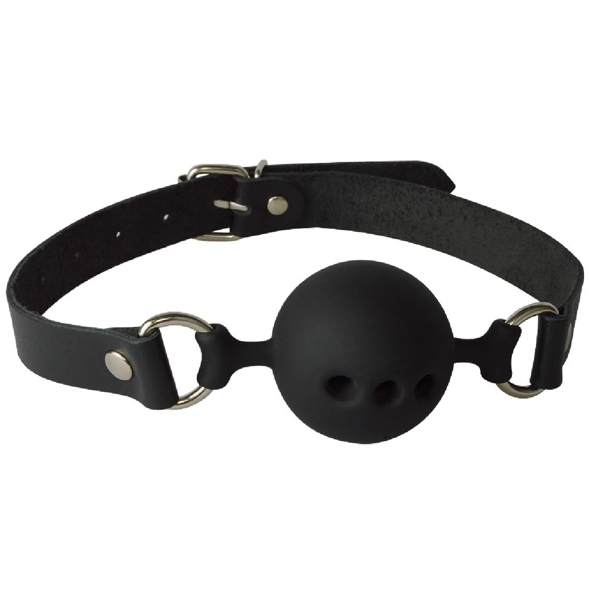 Кляп с кожаным ремешком черного цвета. Сам кляп-шар изготовлен из силикона, приятного на ощупь, со специальными отверстиями, пропускающими воздух. Ремешок с пряжкой позволяет подогнать изделие по желаемому размеру. Размер: длина 58 см, ширина ремешка 2,5 см, диаметр 4,4 см. Цвет черный.