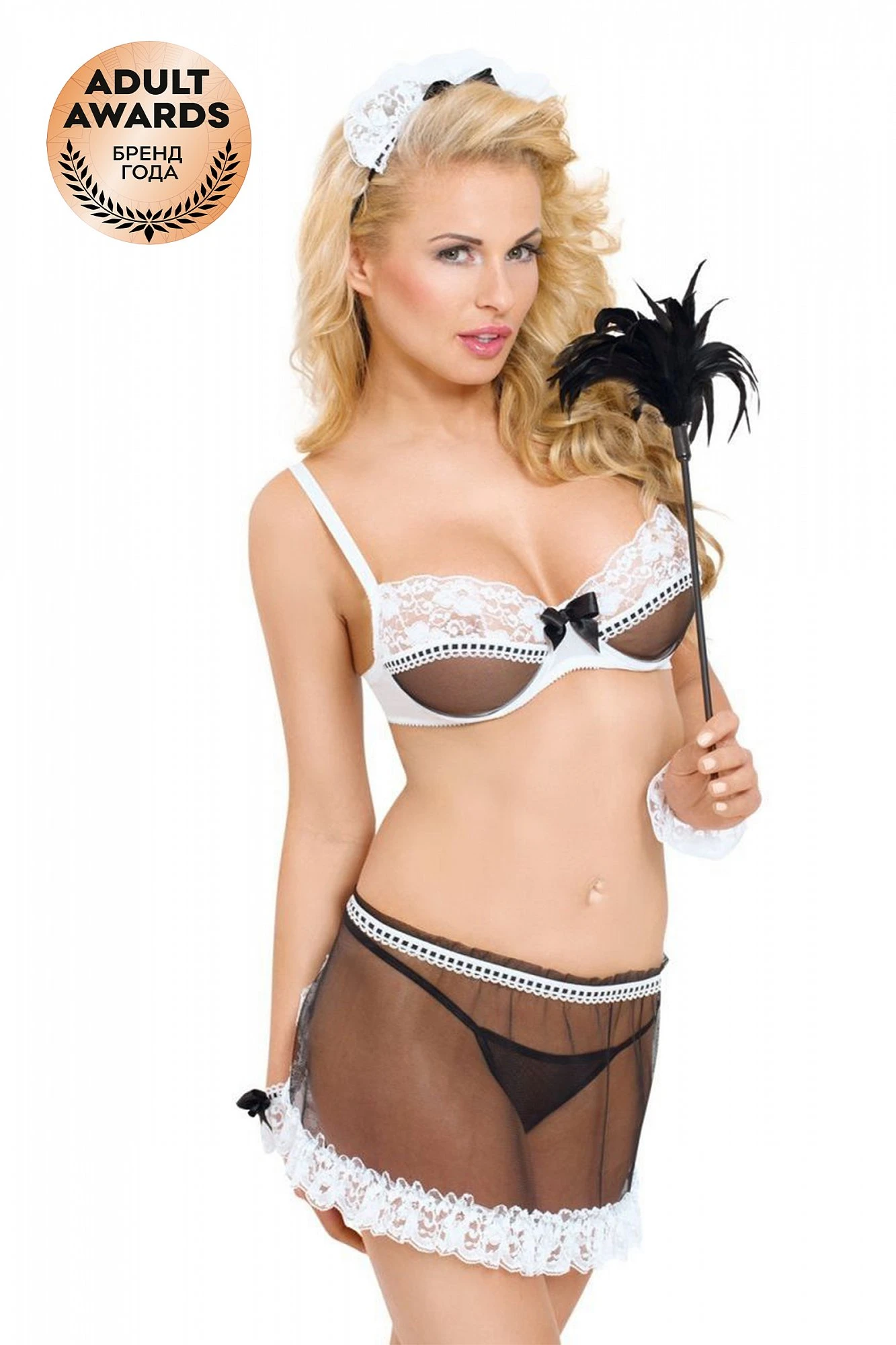 Роскошный комплект официантки: бюстгальтер с косточками, юбочка, головной убор и манжеты. Стринги в комплект не входят. Размер: M (44-46).
