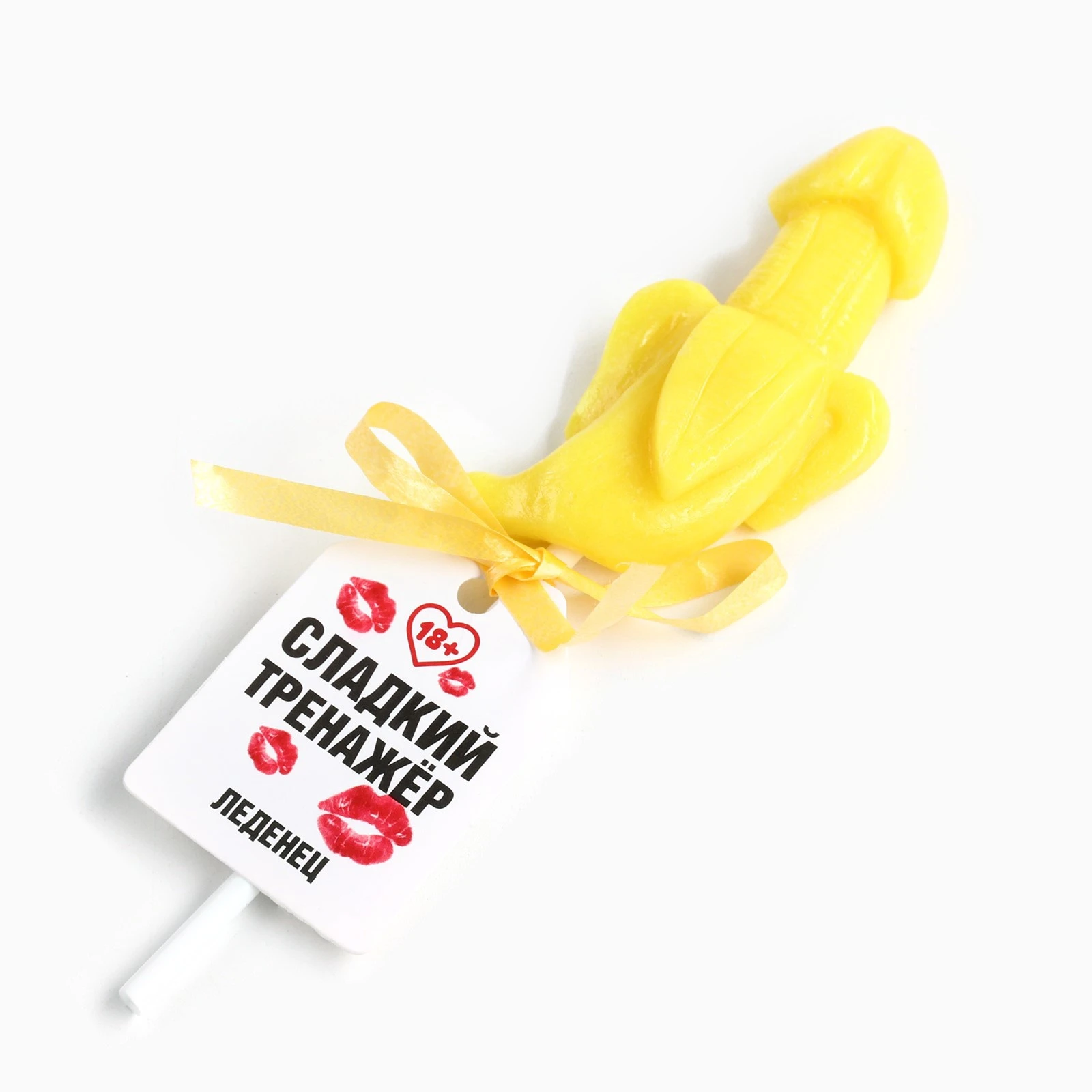Леденец на палочке Сладкий тренажёр. Состав: вода питьевая, сахар песок, патока, лимонная кислота, натуральный краситель, ароматизатор Банан, Е100. Вес: 22 гр.