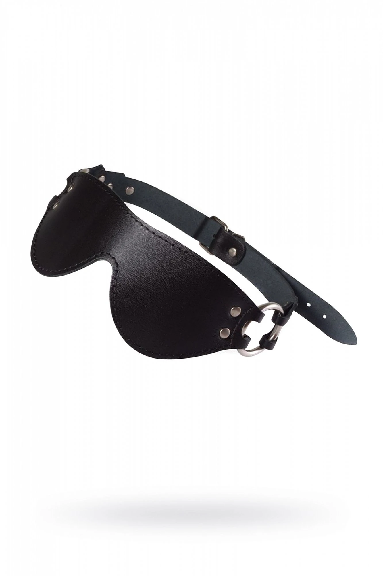 Изготовлена из натуральной кожи с велюровой подкладой. Украшена хромированными заклёпками и кольцами. Размер универсальный. Ремешок с пряжкой позволяет подогнать маску под любой размер. Цвет черный. Размер: длина самой маски 21 см, ширина 7 см.