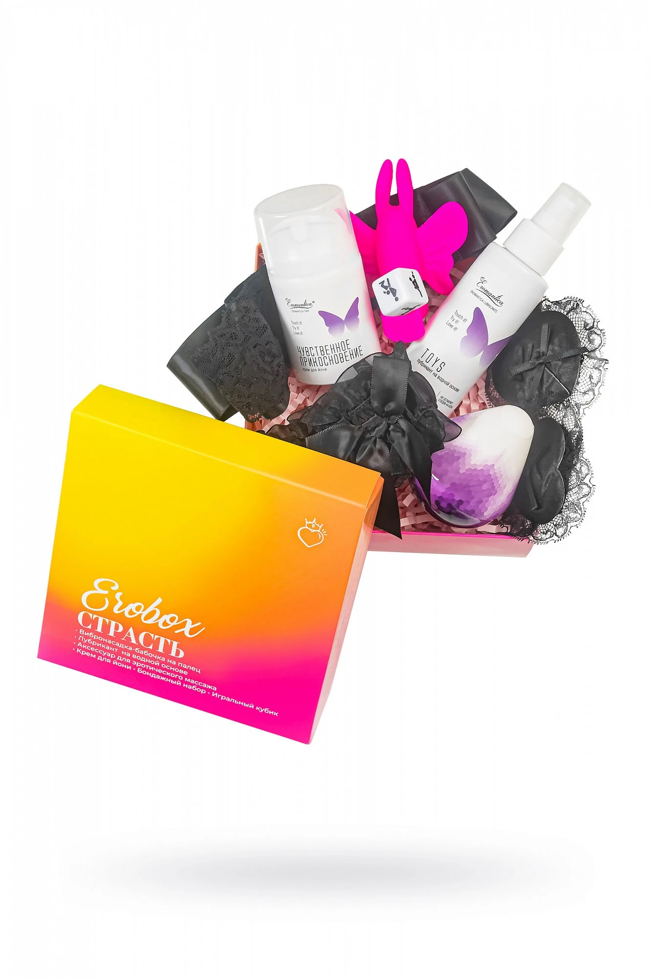 Огненная, неконтролируемая, бушующая, внезапная, яркая, всепоглощающая и только ваша Страсть с одноименным ЭРОбоксом от Eromantica! Подбросьте в воздух игральный кубик и отправьте рутину в отношениях в камин вашей страсти! Предвкушение выпавшей позы усилит влечение друг к другу и вызовет сексуальный азарт. Пикантности эротическим фантазиям добавит изящный бондажный набор. Классическое сочетание черного атласа и кружев на теле повысит возбуждение от сексуального вызова. Чтобы чувственные ощущения стали еще ярче, используйте в любовных ласках весь функционал вибронасадки-бабочки и аксессуар для эротического массажа. Обязательно добавьте к интимным аксессуарам лубрикант на водной основе Toys для комфортного и длительного скольжения. А чтобы прелюдии были не только чувственными, но и горячими, нанесите на интимную зону партнерши крем для йони Чувственное прикосновение.