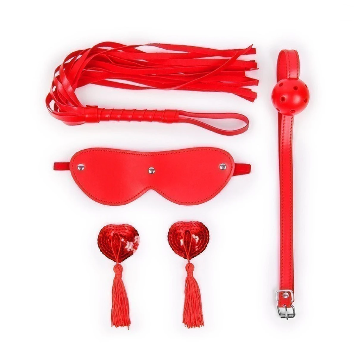 Великолепный набор аксессуаров для любителей БДСМ-игр. В комплект входят плеть, кляп, маска и пэстисы для украшения сосков.