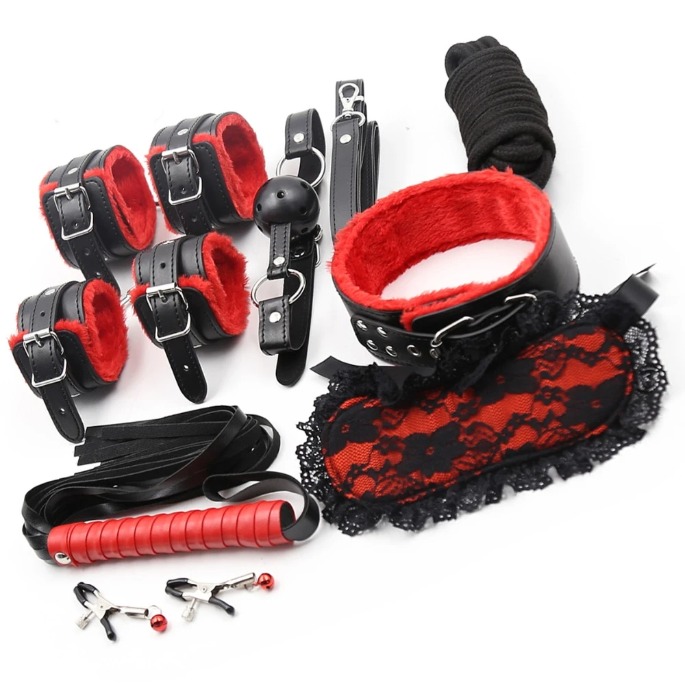 Набор: оковы, верёвка, ошейник, зажимы для сосков, маска, плеть, кляп красный ДBS005
