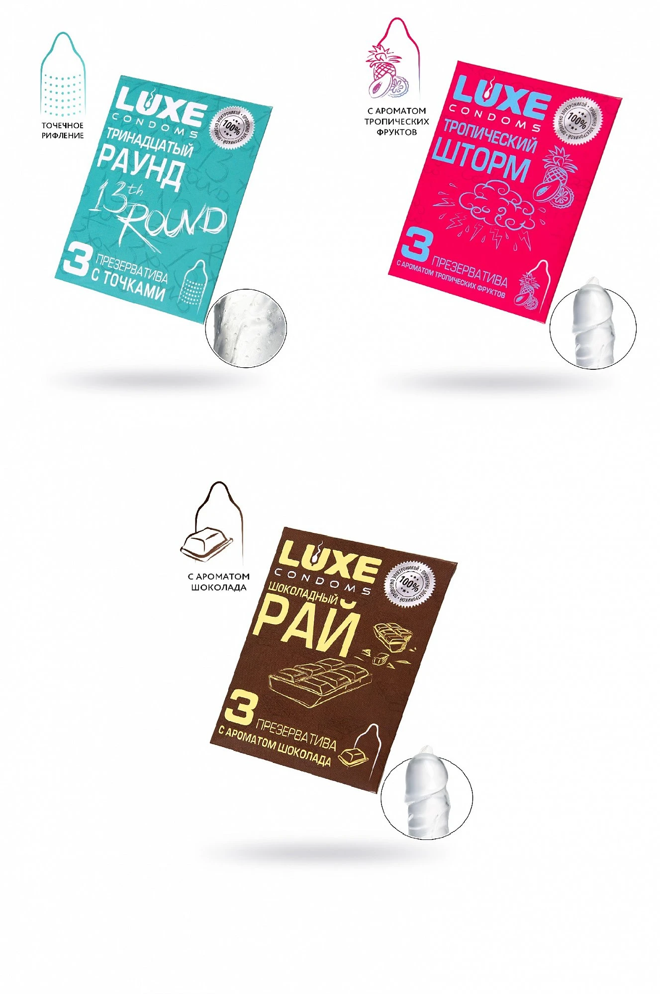 3. Luxe Шоколадный рай с ароматом шоколада, длиной 18 см, в конверте 3 шт. Сет гладких, текстурированных и ребристых презервативов в смазке. В наборе 3 вида по 3 шт. Общее количество презервативов 9 шт.