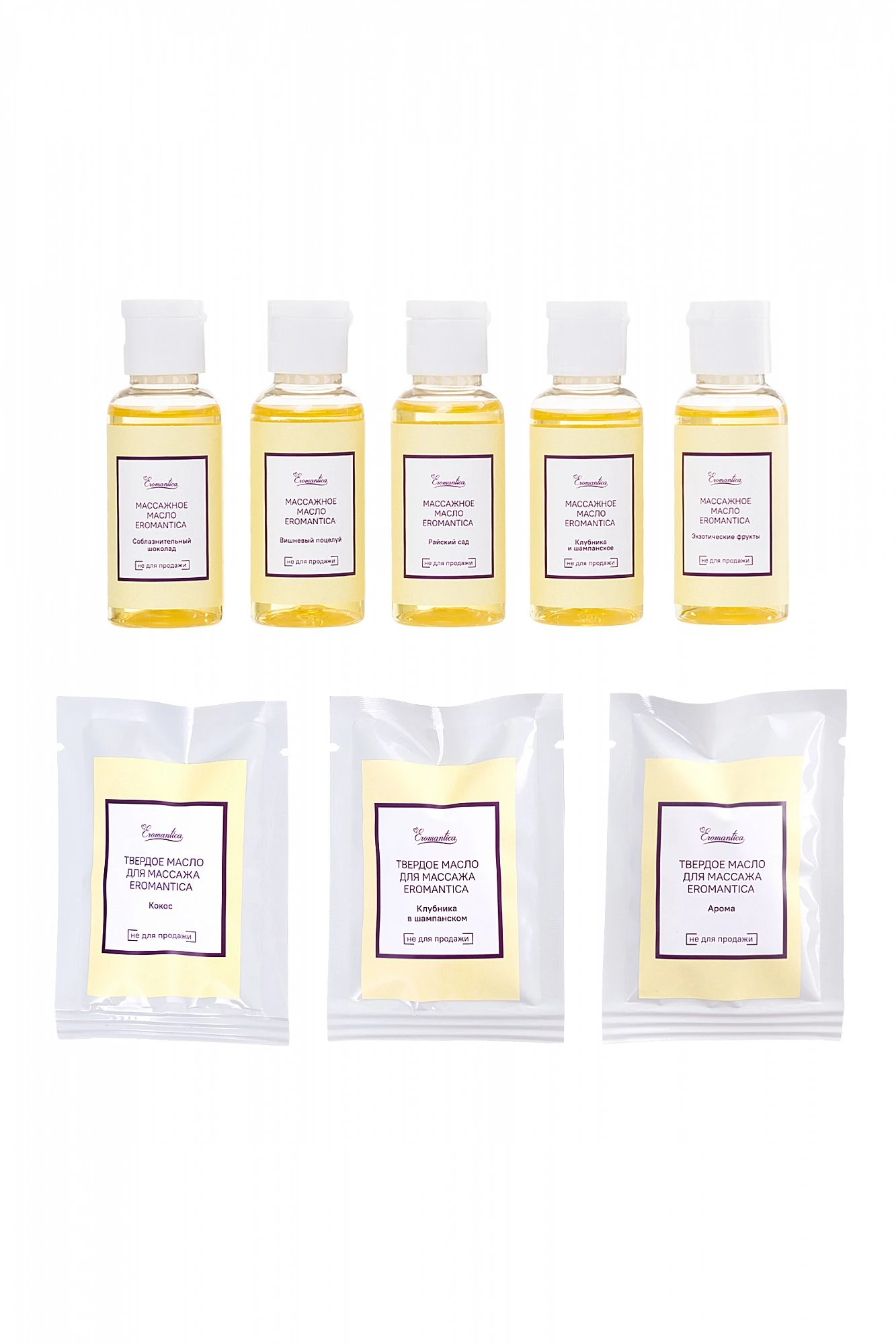 Состав набора: массажное масло Eromantica Вишневый поцелуй 30 мл, массажное масло Eromantica Клубника и шампанское 30 мл, массажное масло Eromantica Райский сад 30 мл, массажное масло Eromantica Соблазнительный шоколад 30 мл, массажное масло Eromantica Экзотические фрукты 30 мл, твердое масло для массажа Eromantica Арома, твердое масло для массажа Eromantica Клубника в шампанском 5г, твердое масло для массажа Eromantica Кокос 5г.