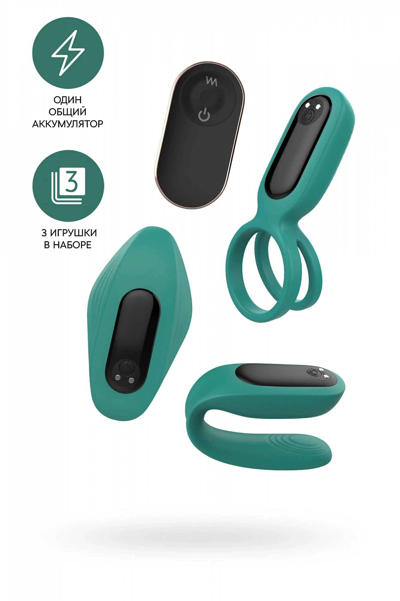Мир меняется и вместе с ним пробуждается желание узнавать свое тело лучше и глубже. Набор из трех разнообразных интимных игрушек с вибрацией создан специально для пар, которые стремятся познавать себя и друг друга, чтобы получать еще больше удовольствия от близости. Эрекционное кольцо, вкладыш в трусики и вибратор-прищепка для одновременной стимуляции. Все три девайса, работают от съемного аккумулятора-вибратора и управляются с помощью пульта. Функционал вибромотора включает 8 режимов вибрации и магнитную USB зарядку. Игрушки выполнены из качественного шелковистого силикона насыщенного изумрудно-зеленого цвета. Для комфортного использования рекомендуется использовать с лубрикантом на водной основе. Для более комфортного использования рекомендуем приобрести смазку на водной основе и очищающий спрей Clear Toy 100 мл для обработки изделия.