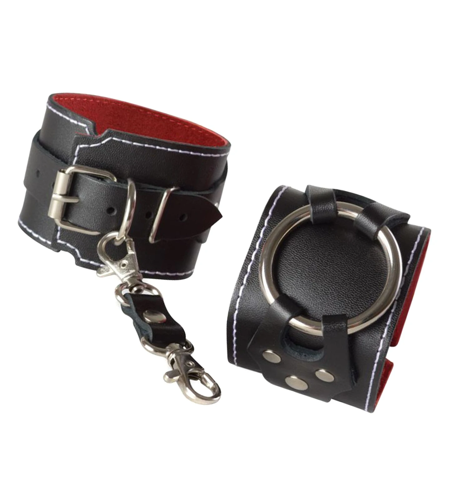 Черные наручники из натуральной кожи от Ситабелла помогут ограничить движения секс-партнёра, достаточно лишь одеть на запястья комфортный, но прочный девайс. Лаконичные, но при этом красивые наручники подойдут, как для женщин, так и для мужчин, т.к. размер легко регулируется при помощи металлической пряжки. Готические фигурные накладки, удерживающие большое металлическое кольцо, придают наручникам агрессивной сексуальности и роскоши. Соединяются наручники при помощи небольших карабинов, скреплённых кожаной перемычкой. Для комфортного использования внутренняя часть наручников выполнена из бархатистой велюровой кожи. Вся металлическая фурнитура имеет никелевое покрытие.