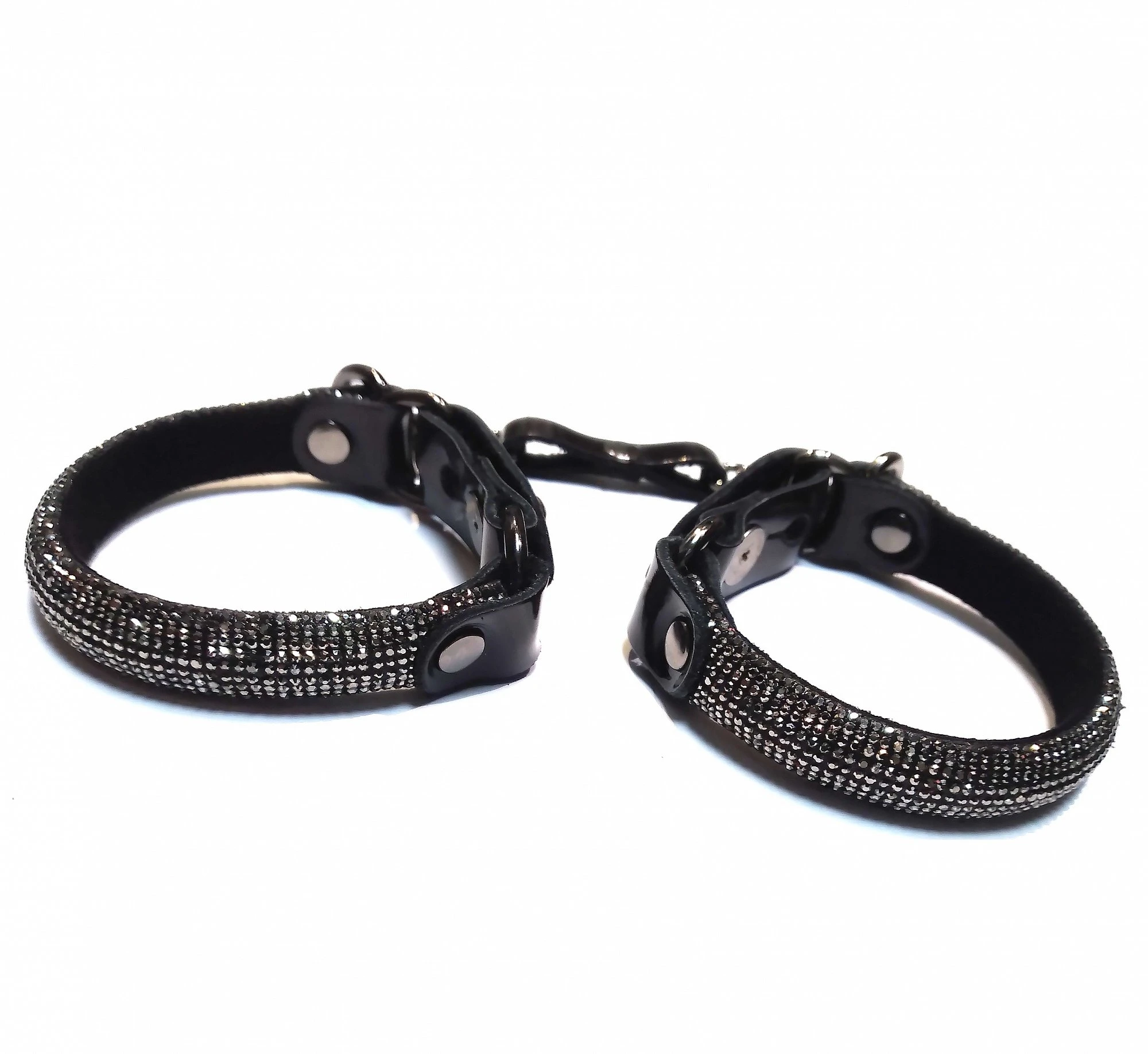 Роскошные черные наручники из натуральной кожи от Ситабелла помогут ограничить движения секс-партнёра, достаточно лишь одеть на запястья комфортный, но прочный девайс. Изделие декорировано по всей длине капельным серебром. Размер легко регулируется при помощи металлической пряжки. Соединяются наручники при помощи небольших карабинов, скреплённых кожаной перемычкой. Вся металлическая фурнитура имеет никелевое покрытие. Размер: общая длина около 20 см, ширина 1,2 см.