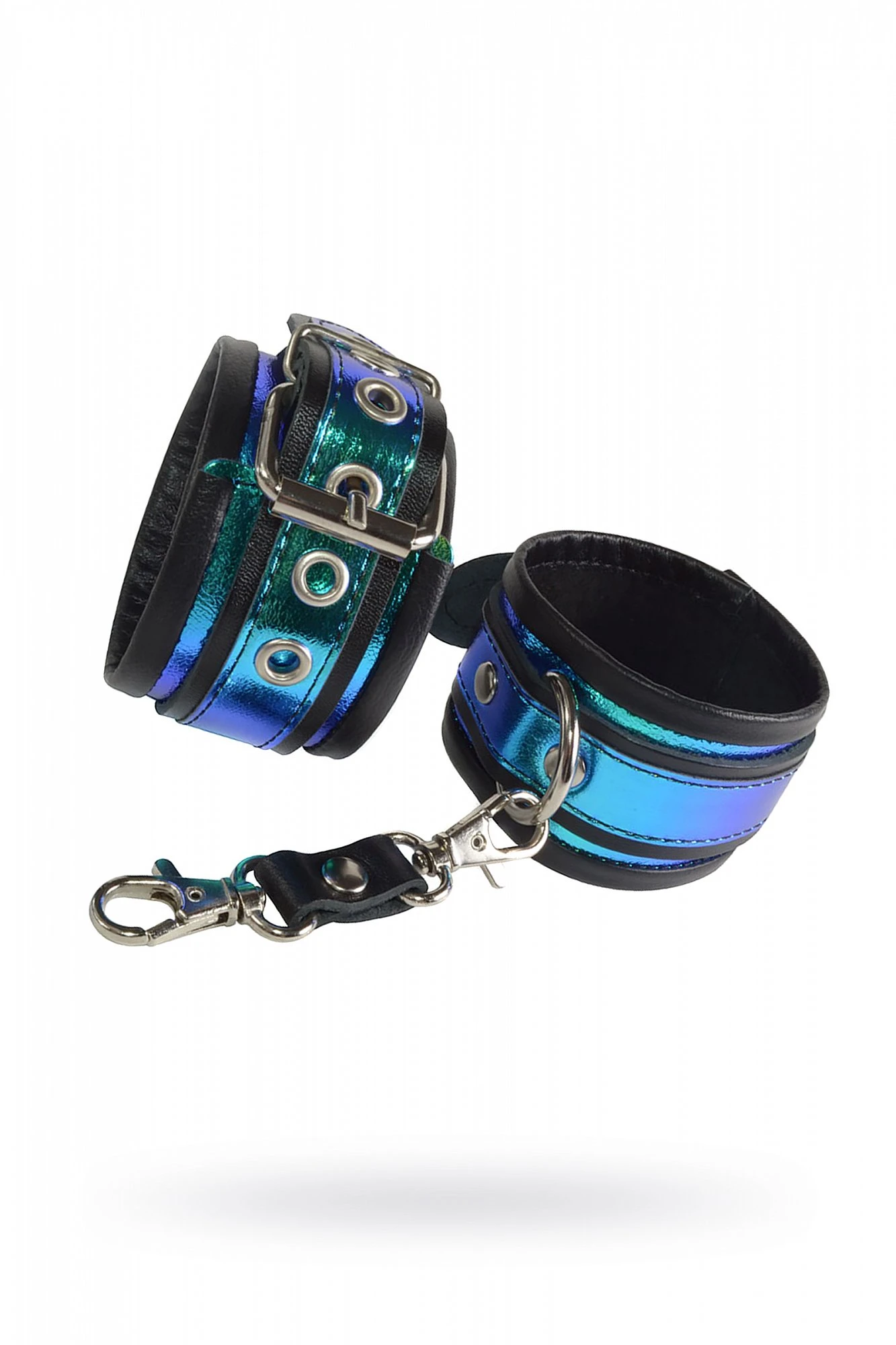 Сияющие наручники от Ситабелла – это яркий и эффектный аксессуар ролевых игр, который поможет не только ограничить подвижность вашего секс-партнёра, но и своим переливающимся видом украсит запястья. Наручники изготовлены из натуральной кожи черного цвета и представляет собой основу шириной 54,8 см, поверх которой проходит ремешок выполняющий, как декоративную функцию, так и регулировочно-фиксирующую. Особенность изделию придает голографическая отделка «хамелеон», которая переливаясь голубым, синим, бирюзовым оттенками, отражает окружающие цвета, которые дополняют девайс своими оттенками. Для комфортного ношения, край наручников обработан оторочкой, что делает их округлой формы. На ремешке располагается металлическая пряжка, при помощи которой можно подогнать изделие по размеру запястья. Соединить наручники можно при помощи карабинов, скреплённых при помощи небольшой кожаной перемычки. Вся используемая металлическая фурнитура имеет никелевое покрытие.Длина наручников с ремешком около 25 см, ширина 4,8 см.