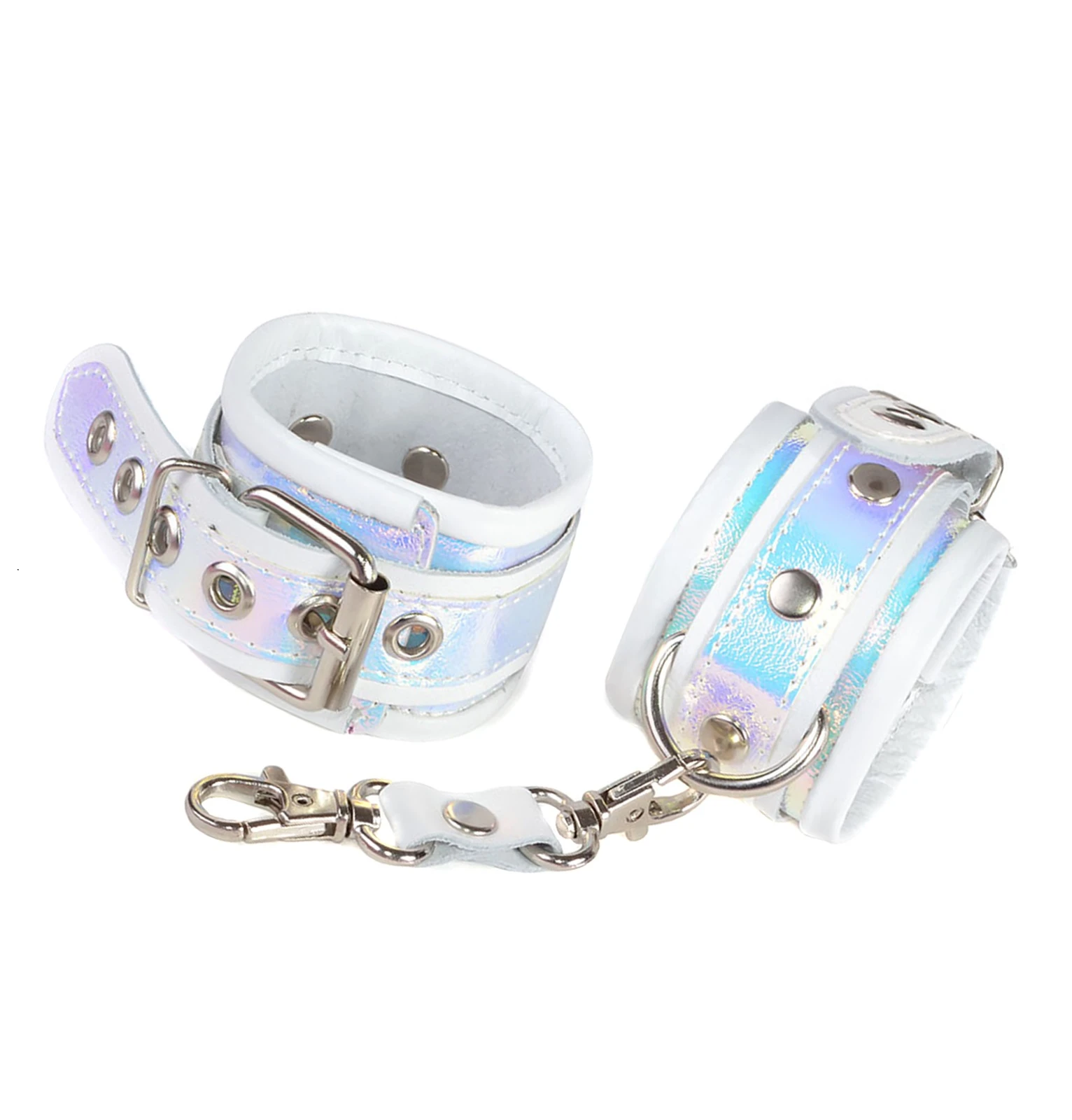 Сияющие наручники от Ситабелла – это яркий и эффектный аксессуар ролевых игр, который поможет не только ограничить подвижность вашего секс-партнёра, но и своим переливающимся видом украсит запястья. Наручники изготовлены из натуральной кожи белого цвета и представляют собой основу шириной 4,8 см, поверх которой проходит ремешок выполняющий, как декоративную функцию, так и регулировочно-фиксирующую. Особенность изделию придает голографическая отделка «хамелеон». Для комфортного ношения, край наручников обработан оторочкой, что делает их округлой формы. На ремешке располагается металлическая пряжка, при помощи которой можно подогнать изделие по размеру запястья. Соединить наручники можно при помощи карабинов, скреплённых при помощи небольшой кожаной перемычки. Вся используемая металлическая фурнитура имеет никелевое покрытие.Длина наручников с ремешком около 25 см, ширина 4,8 см.