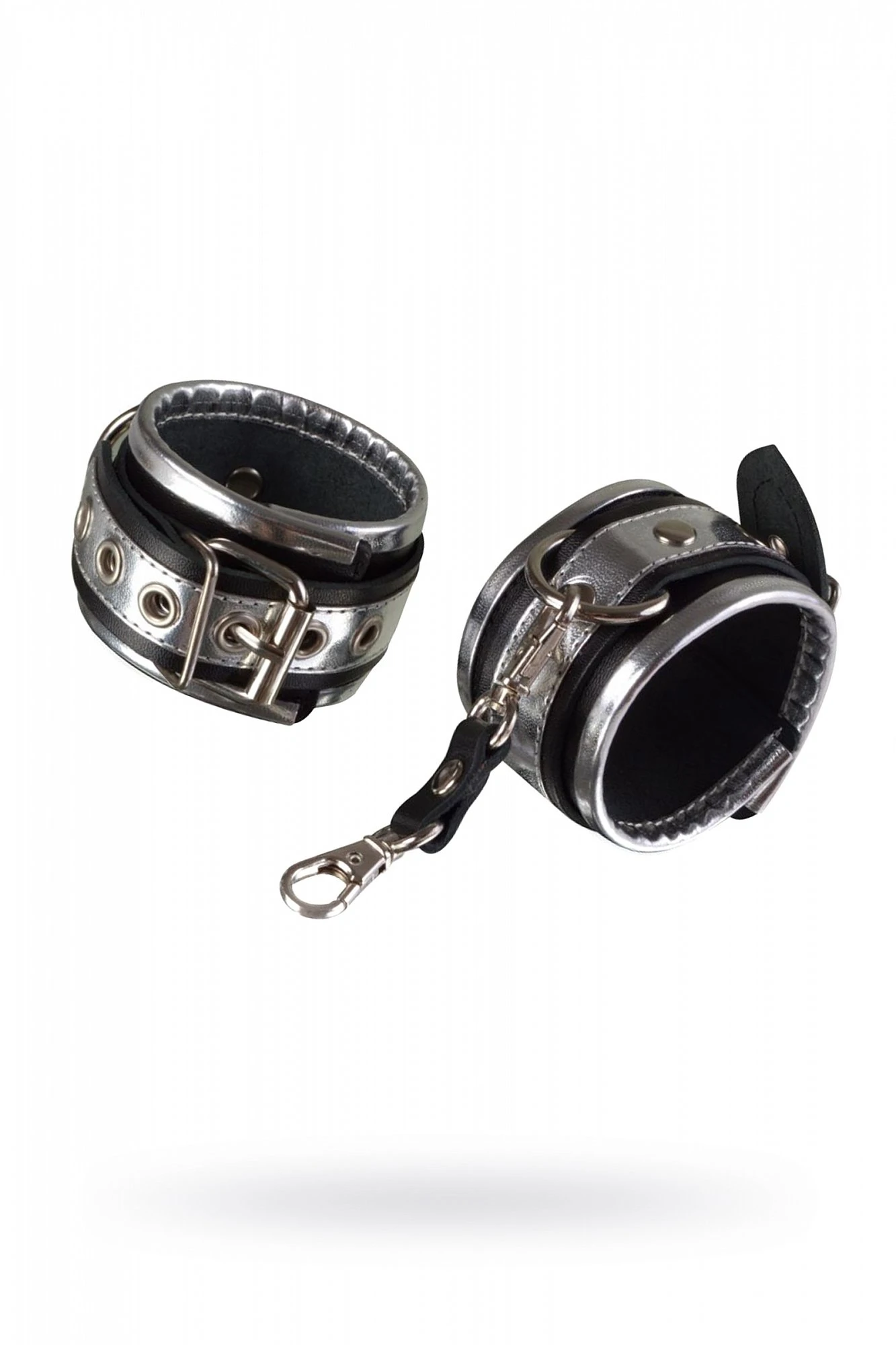 Серебристые наручники от Ситабелла – это яркий и эффектный аксессуар ролевых игр, который поможет не только ограничить подвижность вашего секс-партнёра, но и своим видом украсит запястья. Наручники изготовлены из натуральной кожи и представляет собой основу шириной 4,8 см, поверх которой проходит ремешок выполняющий, как декоративную функцию, так и регулировочно-фиксирующую. Для комфортного ношения, край наручников обработан оторочкой, что делает их округлой формы. На ремешке располагается металлическая пряжка, при помощи которой можно подогнать изделие по размеру запястья. Соединить наручники можно при помощи карабинов, скреплённых при помощи небольшой кожаной перемычки. Вся используемая металлическая фурнитура имеет никелевое покрытие. Длина наручников с ремешком около 25 см, ширина 4,8 см.