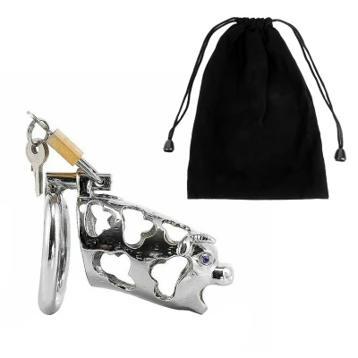В комплект входит насадка, эрекционное кольцо, замочек с набором ключиков, бархатный мешочек. Размер: длина насадки 8 см, диаметр 3,4 см, диаметр кольца 4.5 см. Цвет серебристый.