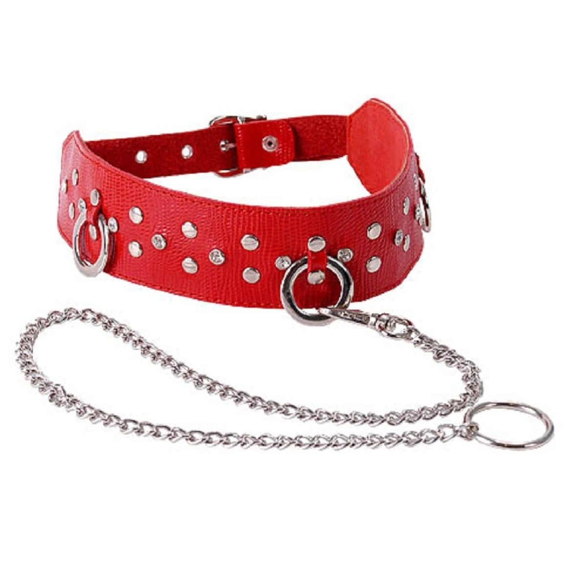 Ошейник из красной кожи. Изготовлен из натуральной кожи с велюровой подкладой. При изготовлении использована никелированная фурнитура. Ширина ошейника 45 мм, длина цепочки (поводка) с карабином 50 см. Размер универсальный. Один из основных атрибутов BDSM. Цвет: красный.
