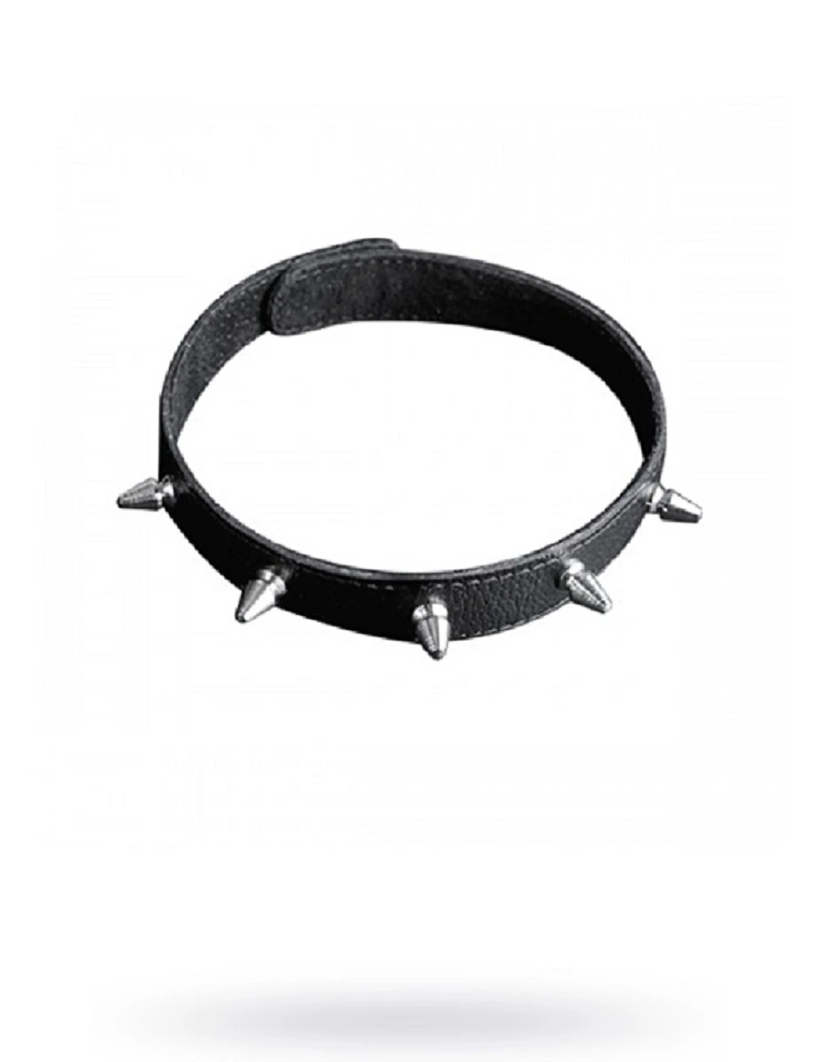 Изготовлен из натуральной кожи с велюровой подкладой. При изготовлении использована никелированная фурнитура. Ширина ошейника 20 мм, длина шипов 12 мм. Размер универсальный, регулируется при помощи кнопок. Один из основных атрибутов BDSM.