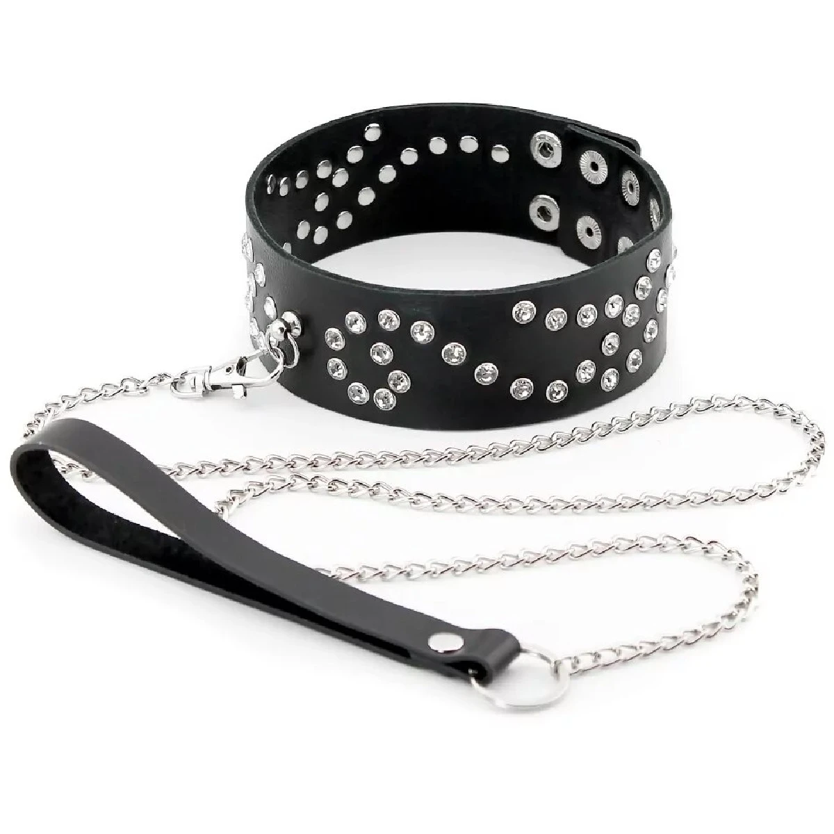 Ошейник широкий со стразами и поводком цепочкой кожа черный OSH-01-bl