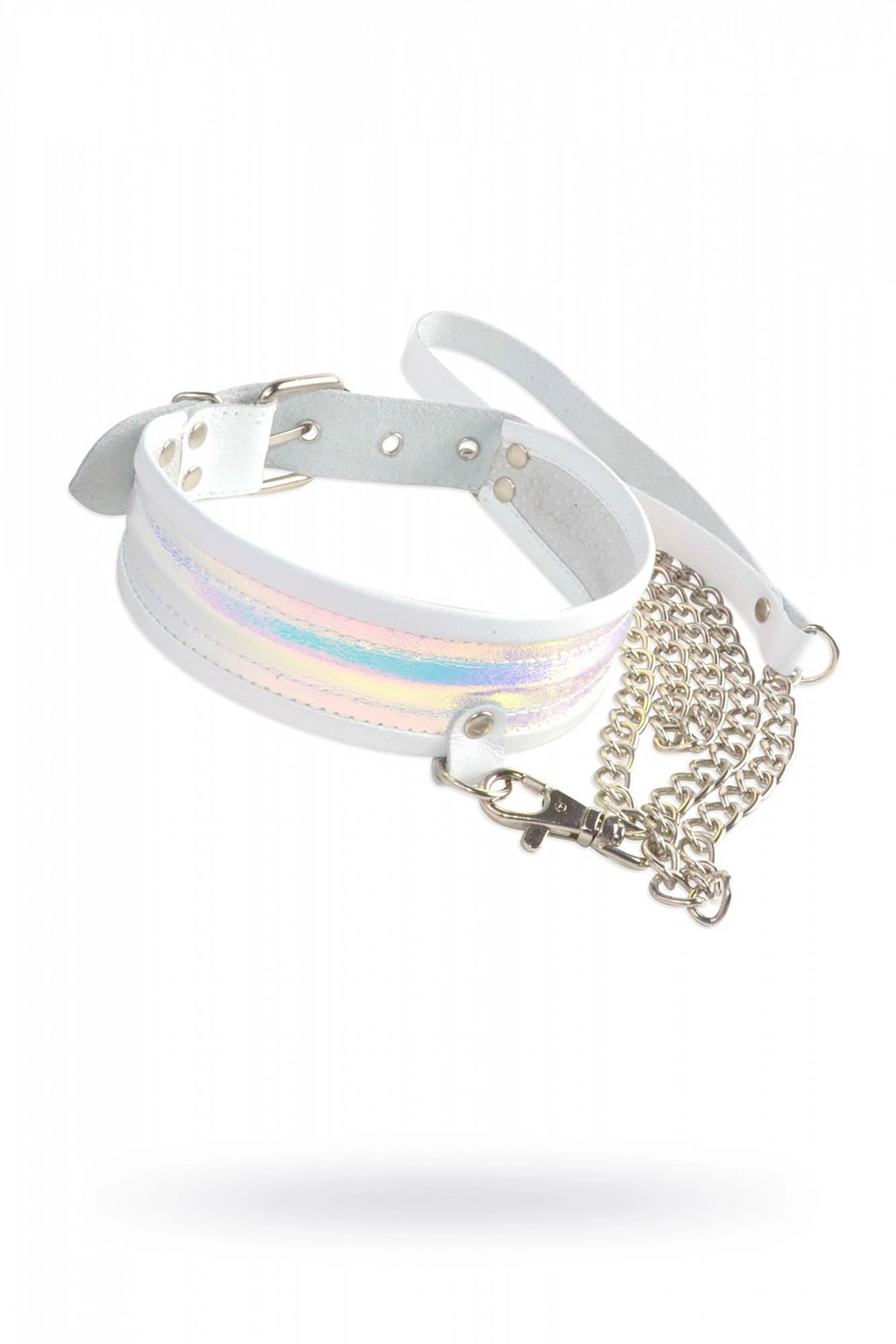 Нежный и эффектный ошейник от Ситабелла станет украшением не только Вашего тела, но сессии BDSM. Белоснежной переливающейся лентой на Вашей шее, он будет вселять уверенность и сексуальность, что не останется незамеченным для партнёра. Ошейник изготовлен из натуральной кожи белого цвета. Для комфортного ношения края обработаны оторочкой, что делает их округлой формы и не позволяет врезаться в нежную кожу шеи. Зафиксировать и отрегулировать размер ошейника можно при помощи металлической пряжки. На передней части ошейника имеется кожаная перемычка, за которую можно прикрепить карабин поводка-цепочки. На поводке также имеется кожаный ремешок-петля для фиксации поводка на запястье. Вся металлическая фурнитура имеет никелевое покрытие. Размер: ширина ошейника 4,5 см, длина ошейника 44 см, общая длина поводка 1 м. Цвет белый.
