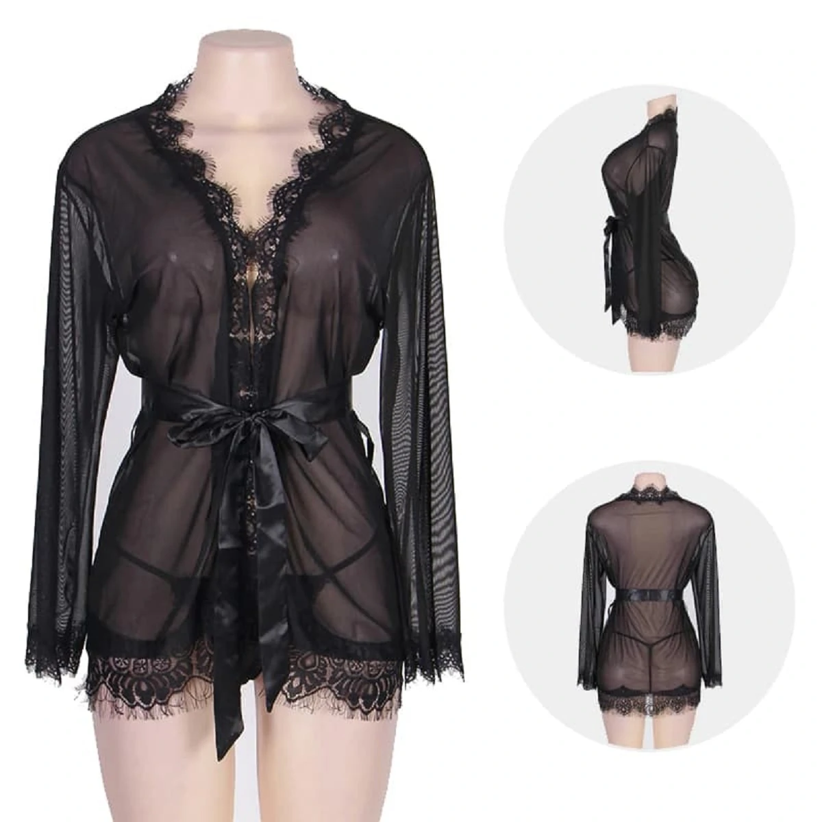 Пеньюар из легкой прозрачной ткани для изысканных леди. Длинные рукава, прозрачность и изящное кружево создают неповторимый образ! В комплекте: пояс и трусики-стринги.Состав: 90% полиамид, 10% эластан. Цвет черный. Размер S/M (42-44).