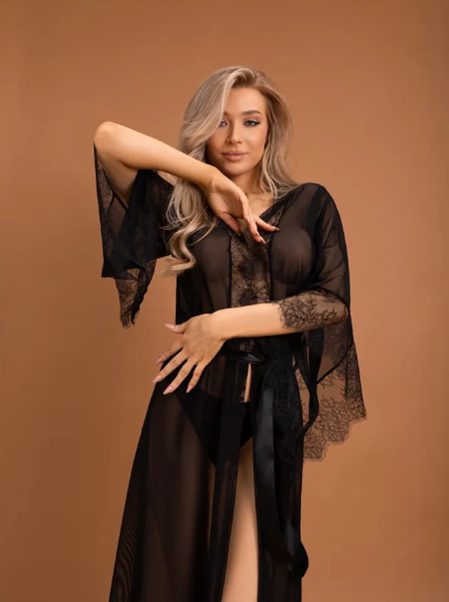 Этот длинный пеньюар создан для тех, кто желает выглядеть элегантно и изысканно. Этот наряд сделан из прозрачной сетки, что позволяет обнажить красивое женское тело, но в то же время не показывая его полностью. При этом, потрясающее тонкое французское кружево с ресничками, отделка края и низа, придают пеньюару особый шарм и изысканность.