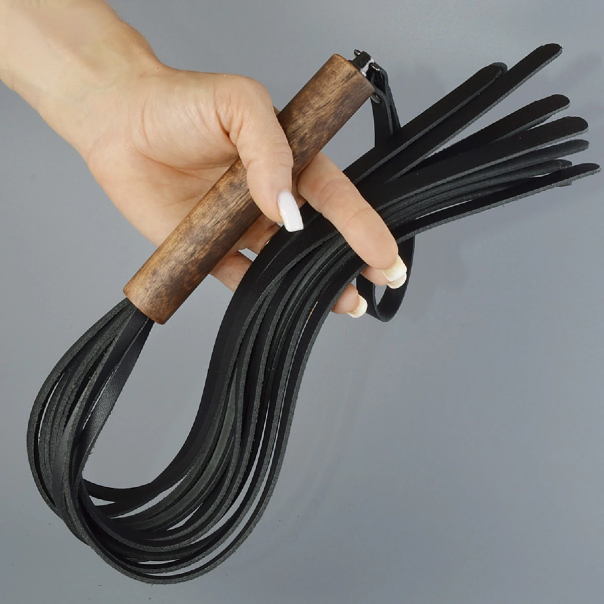 Классическая чёрная плеть – это один из основных атрибутов ролевых игр, при помощи которого, можно и поощрить, поглаживая, и наказать, более сильными ударами, и просто разогреть тело, для обострения тактильной и эмоциональной чувственности. Плеть серии Эко состоит из деревянной рукояти и ударной части, плоские ленты из натуральной кожи черного цвета. Размер: общая длина изделия около 58 см, длина рукояти 14 см, длина плетей 44 см, ширина лент 1 см.