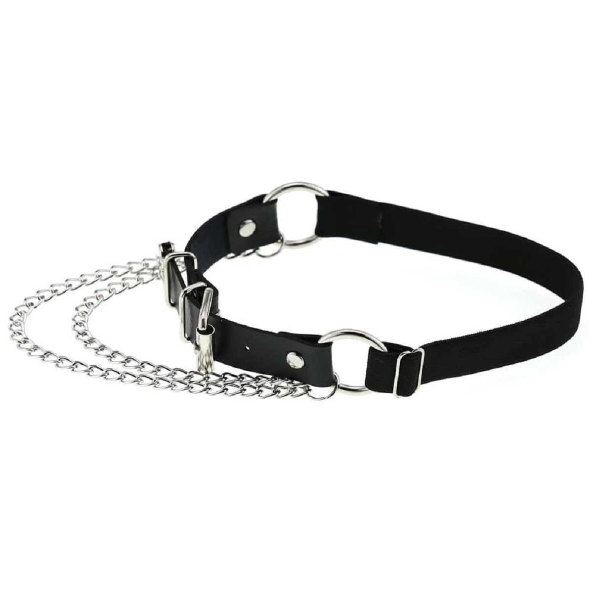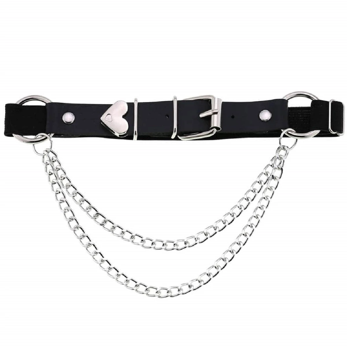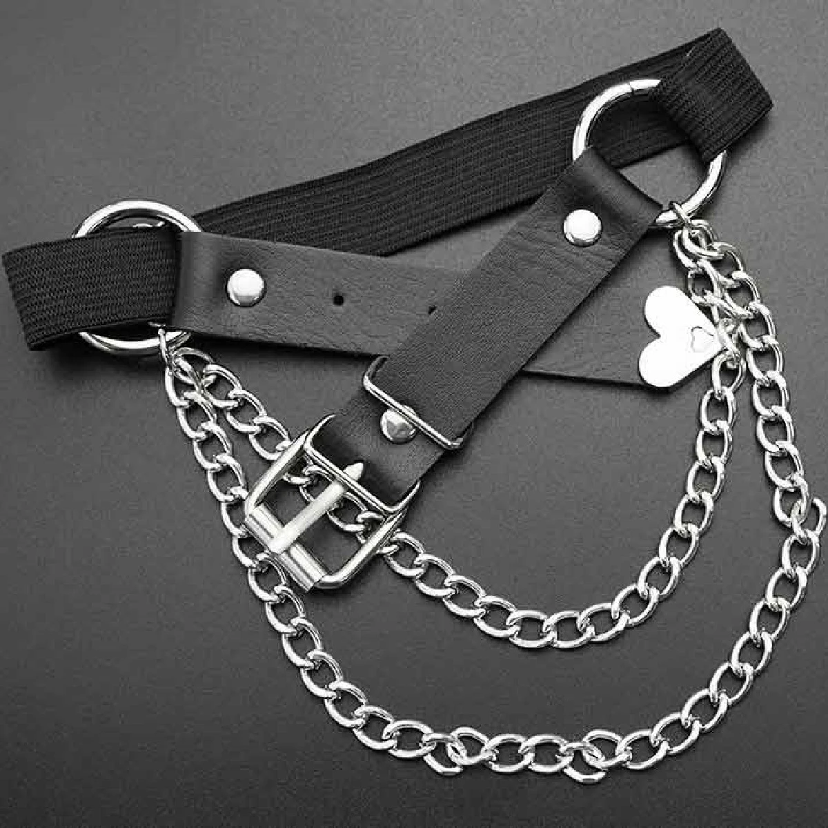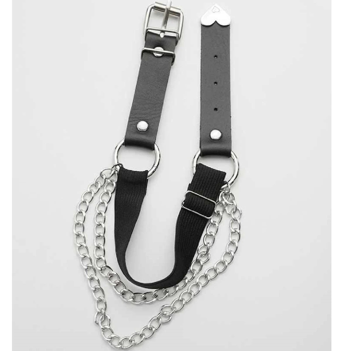 Подвязка выполнена из мягкой искусственной кожи, сзади имеется резинка с регулятором обхвата повязки. Можно использовать как декоративную подвязку на ногу, приковывая к себе внимание окружающих. Изделие оформлено никелированными металлическими цепочками и кольцами. Размер: ширина 2 см. Цвет черный.