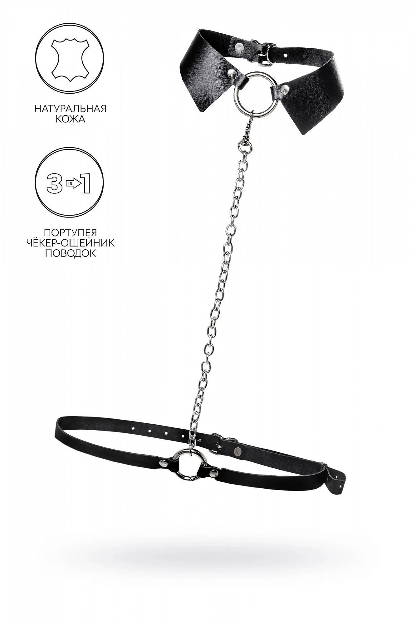 Портупея предназначена на зону шеи и живота. Аксессуар состоит из кожаного воротничка, ремней и металлической цепочки. Преимущество данной портупеи в том, что она легко превращается в ошейник с поводком или без. Натуральная кожа в меру мягкая, не тянется. Материал не вызывает раздражения и приятен на ощупь. Имеет универсальный размер и хорошо садится на девушках с любым телосложением. Регулируется по ширине с помощью стальной застежки. Чокер декорирован металлическим кольцом. К нему крепится небольшой, съемный карабин, который соединяет воротник-ошейник с поясом. Хотите подразнить партнера? В любой момент ремни на талии можно легко и быстро снять, с помощью удобного кольца-карабина. Достаточно только нажать на него и благодаря паре движений превратить пояс в ручку от поводка. Атрибут подчеркивает талию и создаёт акцент на груди. Используйте портупею как яркий аксессуар в гардеробе: сочетайте с рубашкой, водолазкой, платьем, нижним бельем. А также в качестве подарка партнеру.