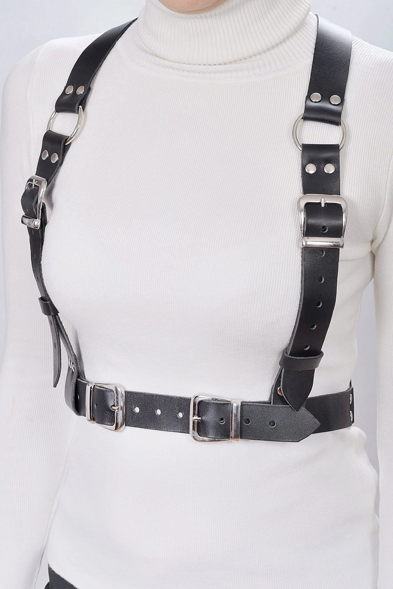 Портупея из натуральной кожи черного цвета с никелированной фурнитурой, беспроигрышный вариант, для придания образу провокационности и сексуальности. Она добавит изюминку к большинству обычных нарядов. Размер XS/M. Цвет черный.