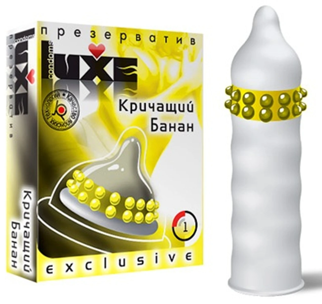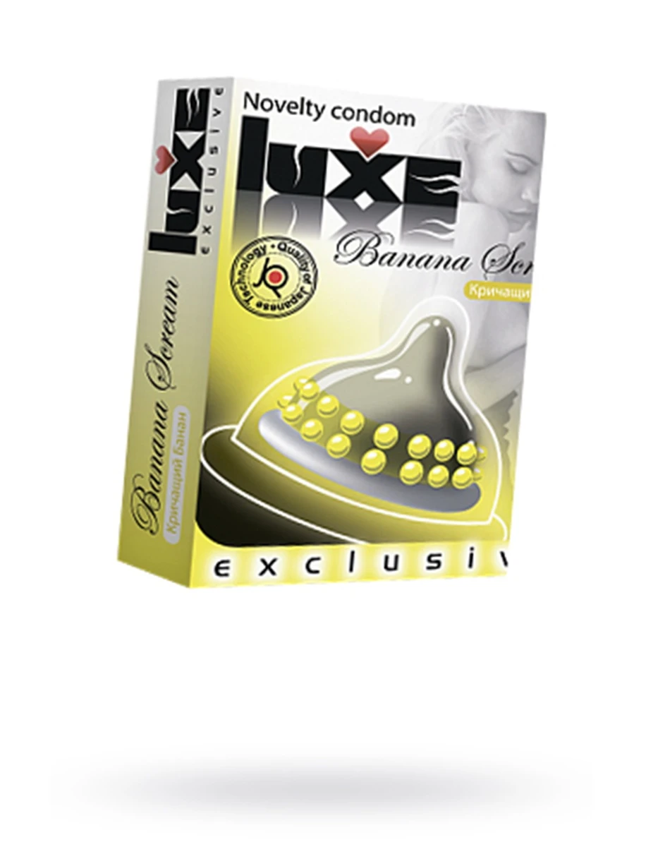 Безопасность и удовольствие — две задачи, которые презерватив Luxe Exclusive «Кричащий банан» решает с завидной лёгкостью. За безопасность отвечает качественный латекс, из которого презерватив изготовлен. А за удовольствие несут ответственность два ряда мягких эластичных шариков. Они украшают половой акт дополнительной стимуляцией эрогенных точек партнёрши. От такого сладкого десерта не захочется отказываться…Высококачественный презерватив, изготовленный из гипоаллергенного латекса, с накопителем и эластичными усиками в обильной силиконовой смазке. Предназначен для одноразового использования. Размер: длина 18 см, ширина 5,2 см, толщина стенки 0,06 мм. В упаковке 1 презерватив.