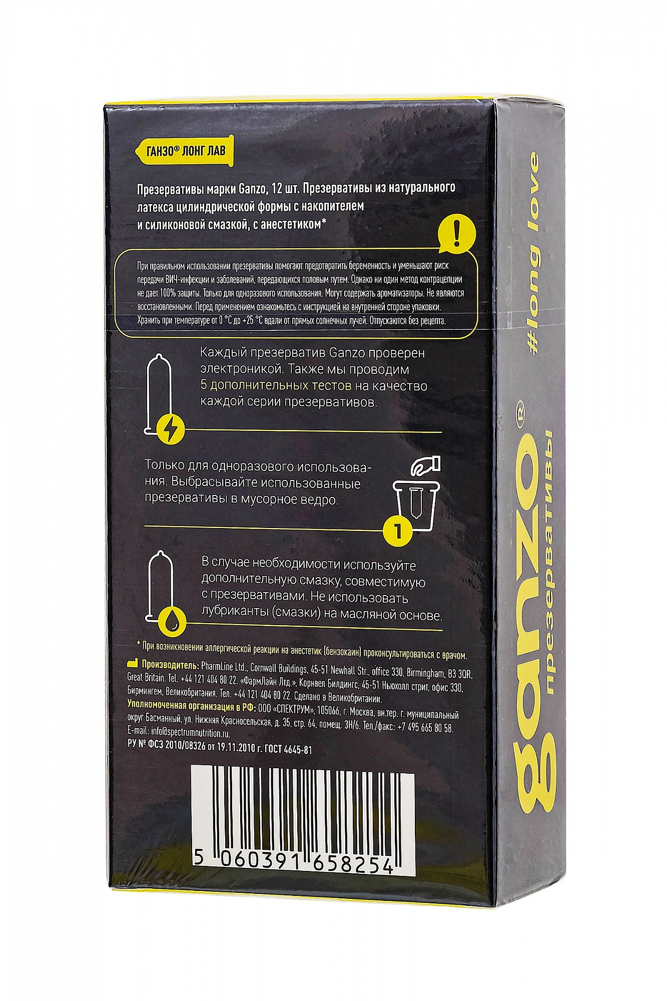 С бензокаином (анестетиком) для продления полового акта. Презервативы Ганзо Лонг Лав из натурального латекса с добавлением анастетика BENZOCAINE, снизят чувствительность рецепторов пениса, что позволит продлить удовольствие, не снижая желания. Ганзо Лонг Лав продлят вашу ночь любви и позволят доставить незабываемое удовольствие вашей партнерше. Презервативы из натурального латекса цилиндрической формы с накопителем и силиконовой смазкой с добавлением анестетика бензокаина, который продляет половой акт. Размер: длина 18 см, ширина 5,2 см, толщина стенки 0,06 мм. В упаковке 12 шт.