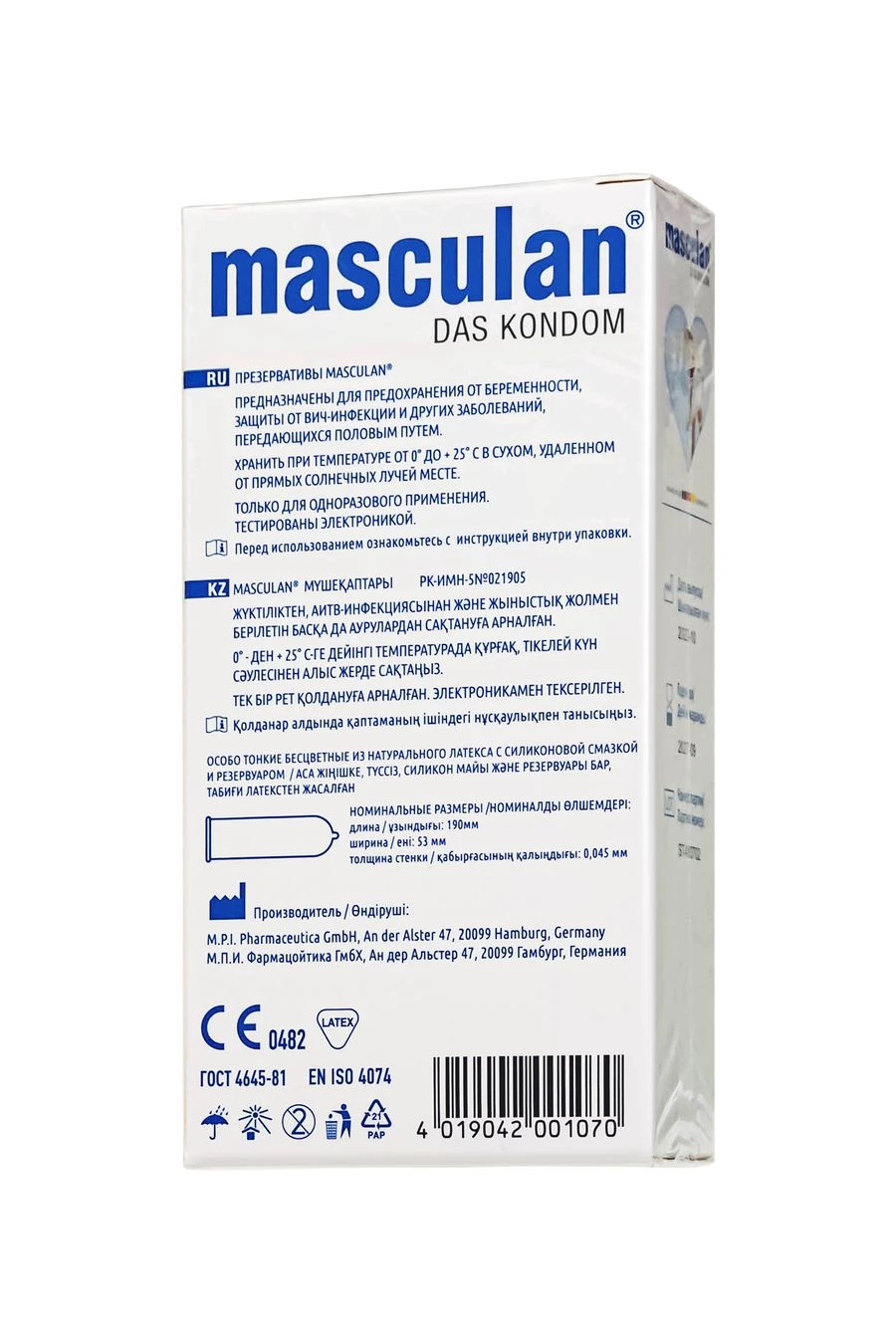 Masculan – это презервативы премиум-класса, разработанные в Германии с соблюдением высочайших стандартов качества и дизайна. Немецкое производство, высококачественное сырье, и электронное 6-ти ступенчатое тестирование каждого презерватива обеспечивают безопасность и надежность. Размер: длина 19 см, диаметр 5,3 см, толщина стенки 0,05 мм. В упаковке 10 шт.