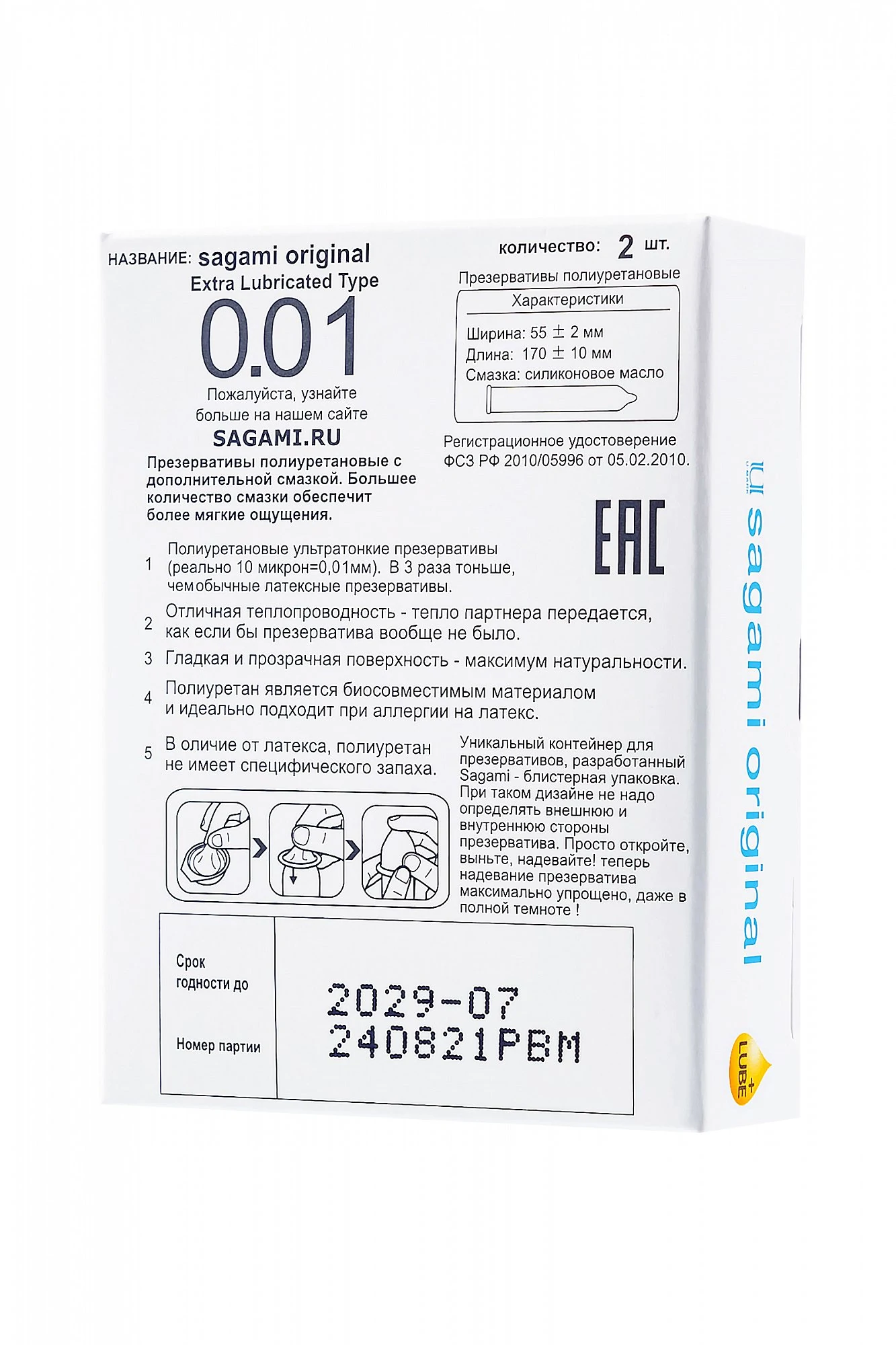 Новая серия полиуретановых презервативов Sagami Original 001 с увеличенным количеством смазки - Extra Lubricated. Созданы специально для любителей полиуретановых презервативов Sagami, которым, по той или иной причине, не хватает смазки во время использования. Эволюционное продолжение линейки самых тонких в мире полиуретановых презервативов Sagami Original. Еще больше мягких и естественных ощущений. Ничего лишнего! Толщина достигает 10 микрон (измерено по стандартам Sagami). Такая толщина достигнута благодаря возможностям полиуретана и постоянному совершенствованию технологий компании Sagami.