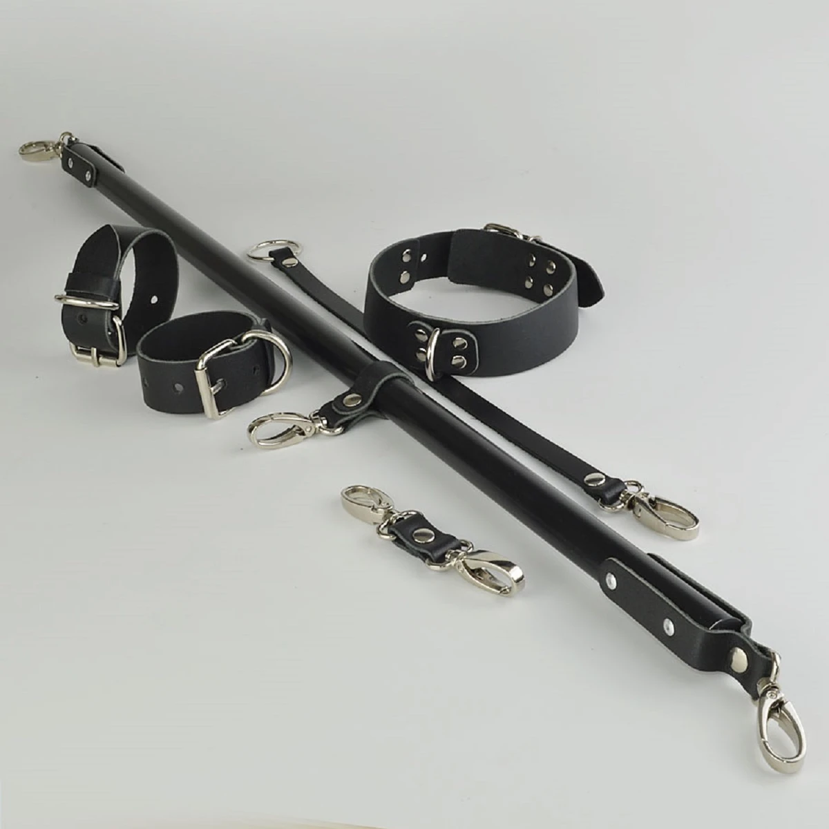 Распорка комплект универсальный включает в себя распорку, наручники Новичек и ошейник Новичек. Фиксирующая BDSM распорка от Sitabella поможет ограничить подвижность партнёра. Девайс состоит из цилиндрической металлической основы черного цвета и трёх креплений из натуральной толстой кожи, к которой прикреплены карабины для фиксации ошейника, наручников или оков. Карабины имеют никелевое покрытие. Длина распорки 55 см. Черные наручники из натуральной кожи Новичек, общая длина около 23 см, ширина 2,5 см. Чёрный ошейник из толстой натуральной кожи Новичек, общая длина ошейника 42 см, ширина 3 см.