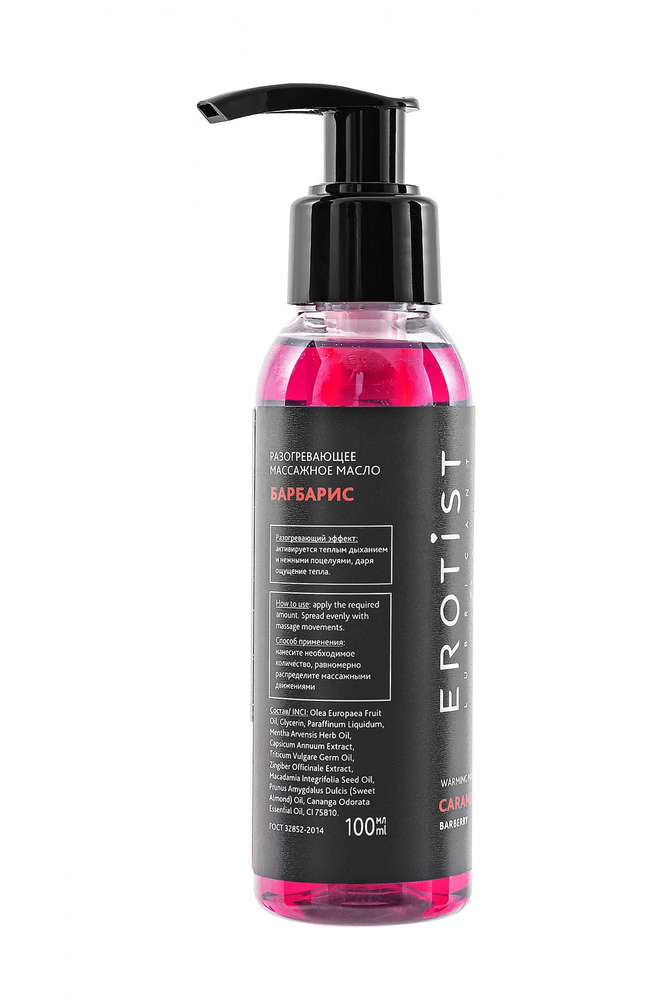 Барбарис из серии Caramel Club - это яркое сочетание сладости и лёгкой кислинки, знакомое с детства. Его аромат добавляет игривости и свежести, а эффект мягкого согрева делает массаж живым и чувственным. Масло содержит натуральные компоненты: оливковое масло, масло сладкого миндаля, макадамии и зародышей пшеницы, которые ухаживают за кожей, питая и увлажняя её. Экстракт имбиря и перца стимулируют мягкий разогревающий эффект, повышая чувствительность. Масло мяты и иланг-иланга добавляют свежести и расслабления, превращая массаж в настоящий ритуал. Особенности: необычный ягодно-карамельный аромат барбариса. Разогревающий эффект активируется дыханием. Масло легко распределяется и не оставляет липкости. Подходит для романтических игр и чувственных экспериментов. Способ применения: нанесите несколько капель масла на кожу и выполните массаж. Уютное тепло, насыщенный аромат барбариса и питательная формула сделают процедуру яркой и запоминающейся.