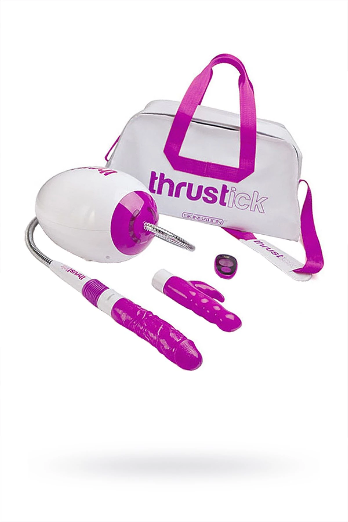Секс-машина Thrustick (Трастик) – это уникальная секс-игрушка в индустрии товаров для взрослых. Секс-машина предлагает 6 различных режимов вибрации и 8 скоростей проникновения - и все это в одном компактном наборе! Режимы скоростей отображаются на жидкокристаллическом дисплее пульта дистанционного управления, благодаря чему вы всегда будете знать, какой из режимов нужен именно сейчас. Действие пульта дистанционного управления распространяется на расстояние до 10 метров. Но самое главное: секс-машина Thrustick единственная на сегодняшний день имеет подогрев насадок фаллоимитаторов! Таким образом, имитируется естественная температура живой плоти. Нагрев начинается примерно через 7-8 минут после включения секс-машины. При этом не требуется одновременного включения функций вибрации или фрикций. Температура нагрева - около 40 градусов.Секс-машина Thrustick имеет два съемных фаллоса. Один можно использовать также для стимуляции точки G, а у другого есть дополнительный отросток для стимуляции клитора.