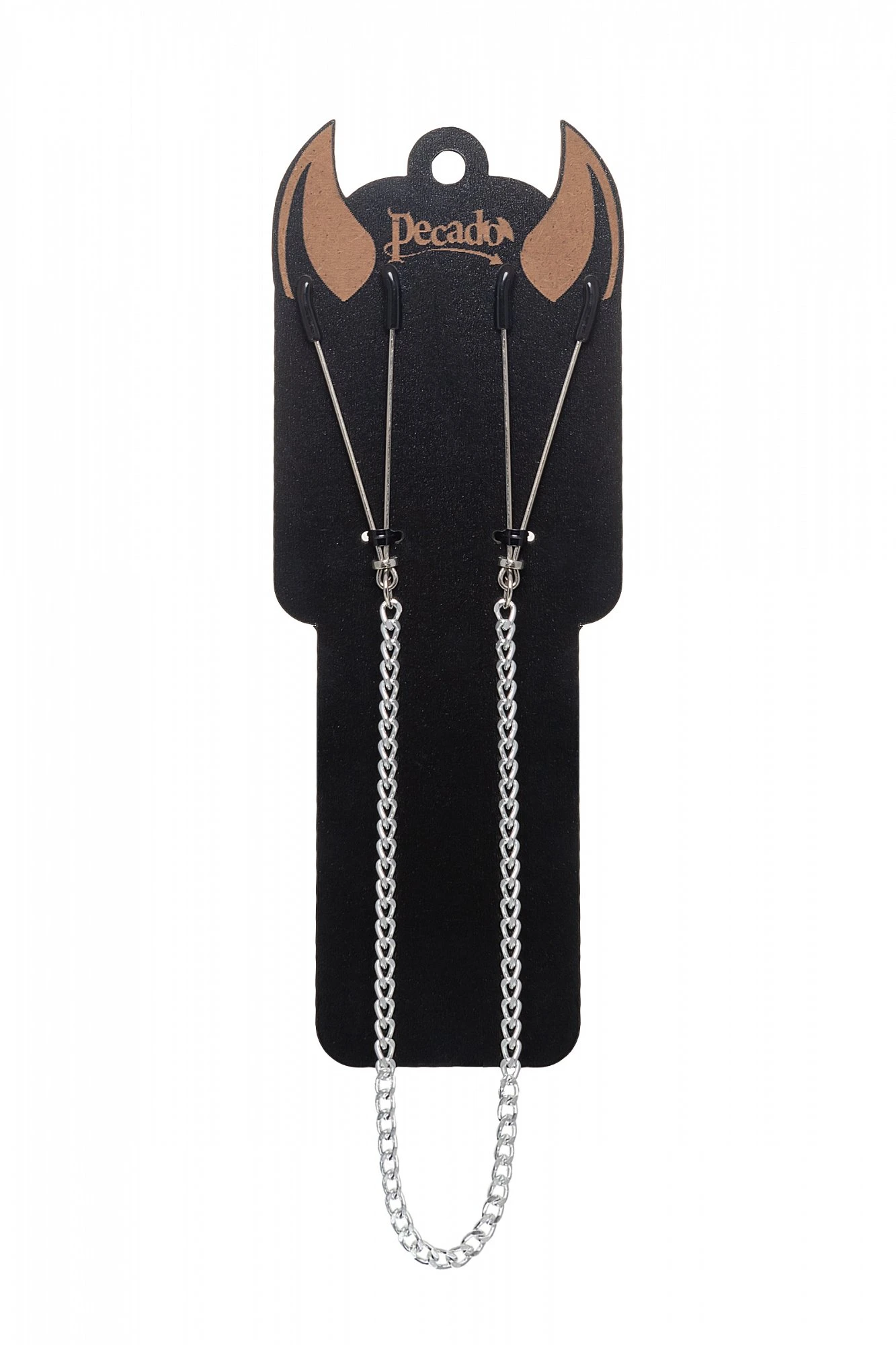 Зажимы-вилки от Pecado гарантируют смешение ярких чувств от тактильного контакта с нежной кожей сосков. Зажимы выполнены из высококачественного металла. Интенсивность сжатия аксессуара регулируется миниатюрными колечками. В зависимости от личных предпочтений и сценария игры, можно выбрать легкое пощипывание, или сильное сдавливание. Также подходит для стимуляции и возбуждении в области половых губ и клитора. Общая длина зажимов 7 см, длина цепочки 31 см. Не требуют специального ухода.