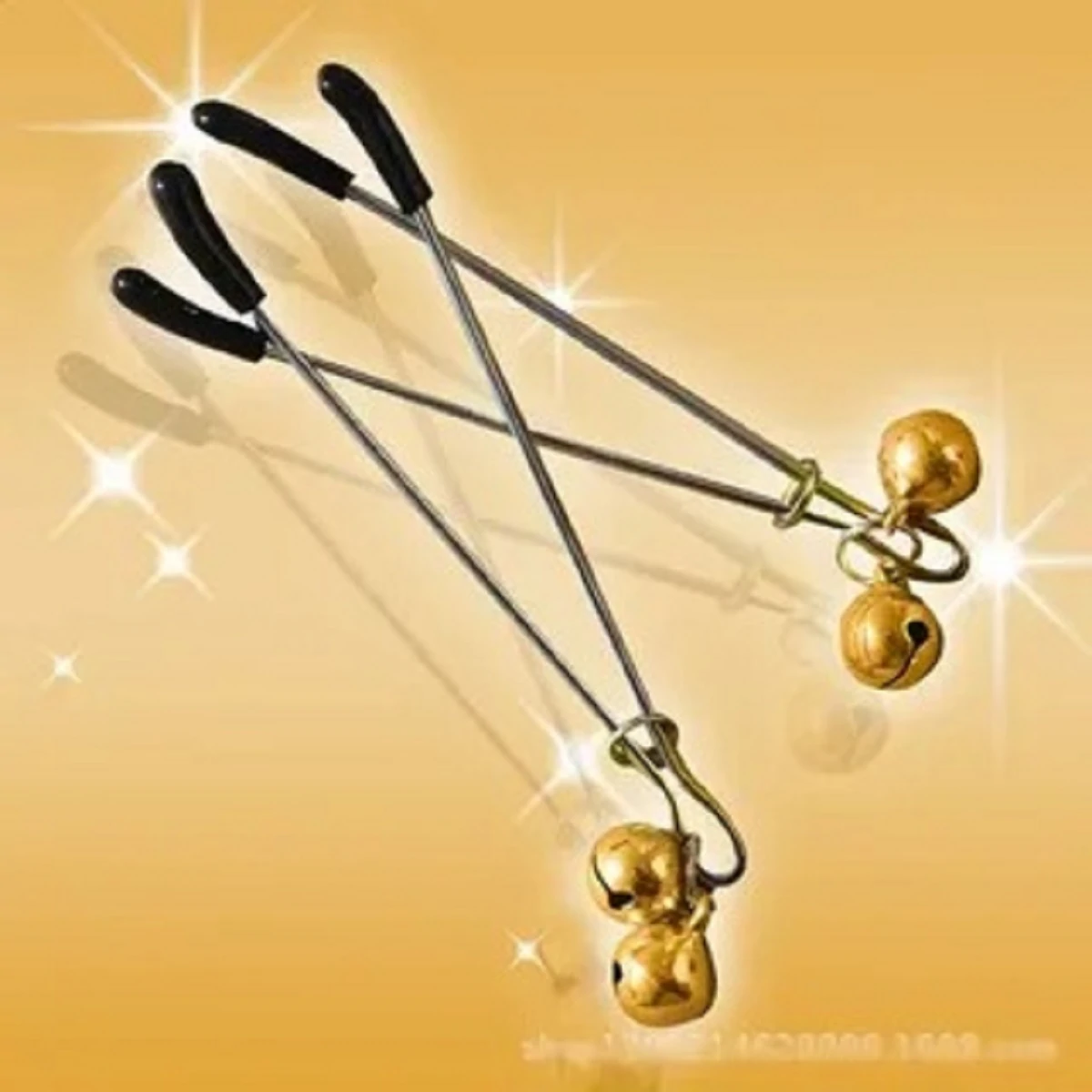 Украшение в виде зажимов серебристого цвета с золотистыми бубенчиками стимулируют соски и подчёркивают сексуальность. Оборудованы резиновыми наконечниками и регуляторами давления нажима,что позволит контролировать боль. Размер: длина 9 см.