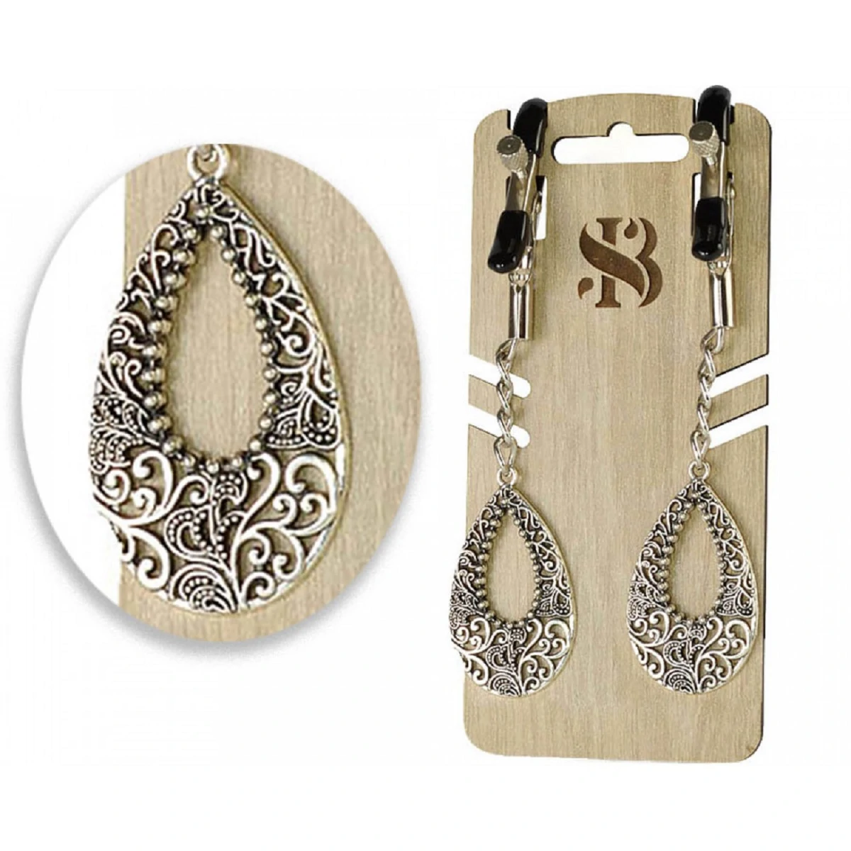 Роскошные зажимы на соски Шахерезада украсят тело и добавят пикантных ощущений. Зажимы имеют регулятор и полимерные наконечники на концах. Размер подвесок 48*30 мм. Металл.